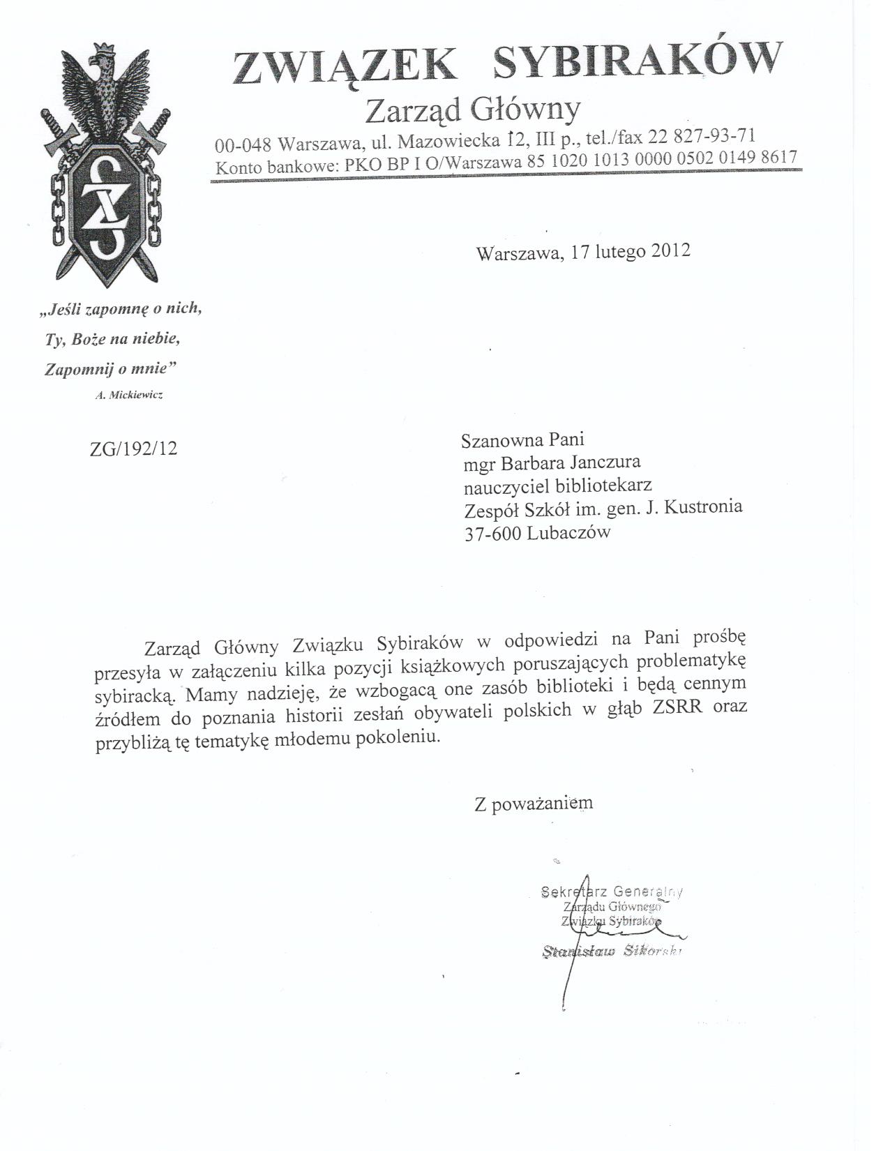 Pismo do Zespołu Szkół im. gen. J. Kustronia w Lubaczowie