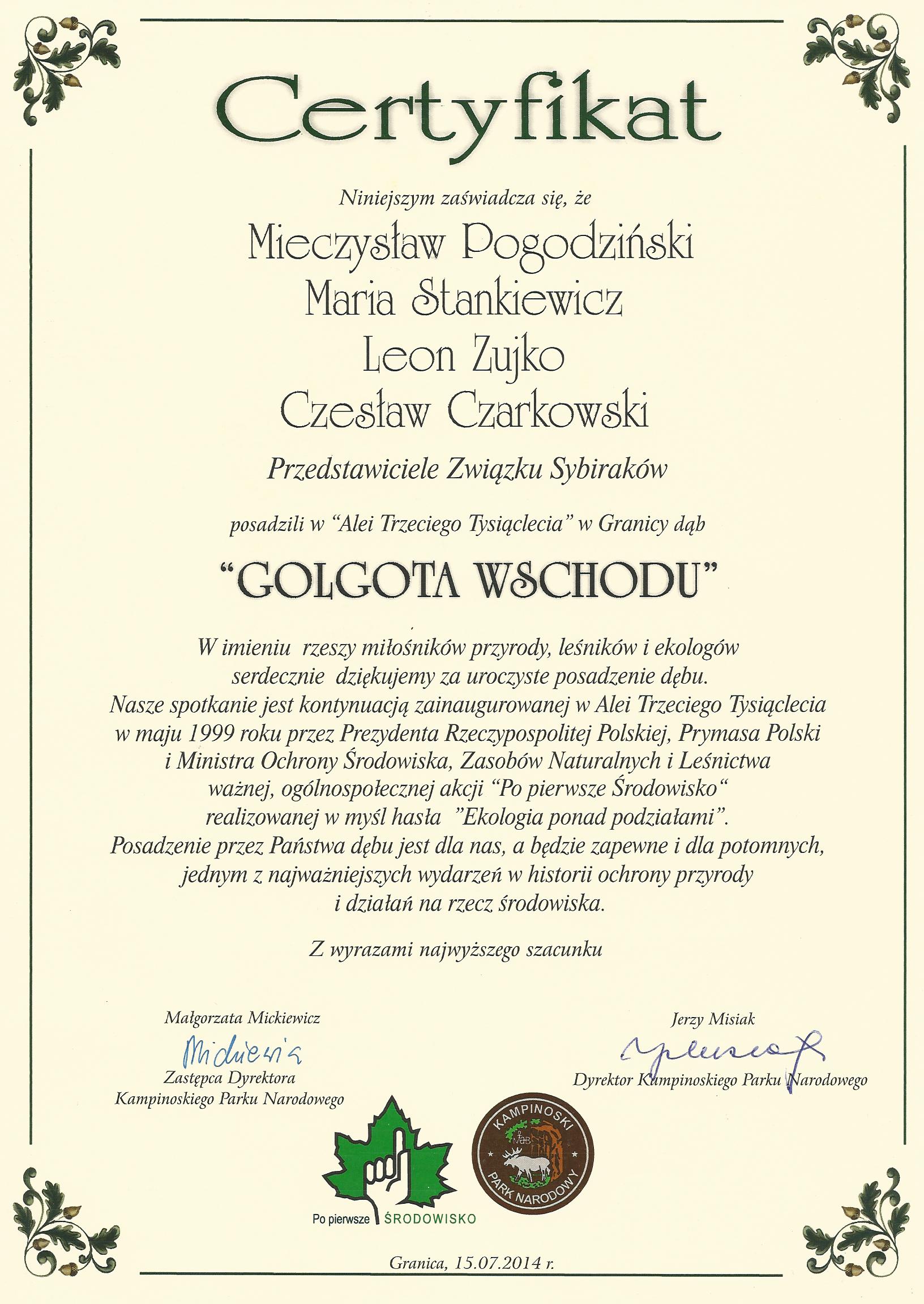 Certyfikat posadzenia dębu „Golgota Wschodu”