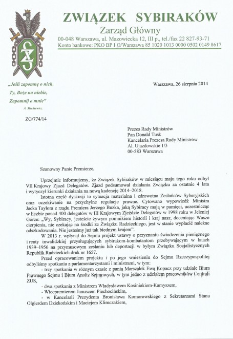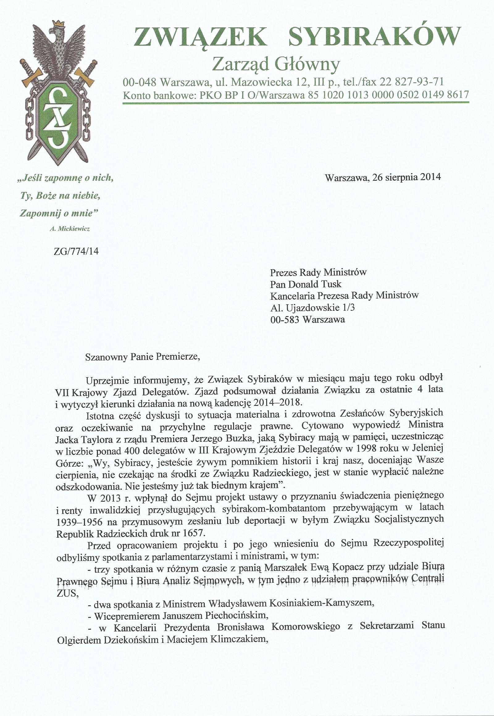 Pismo do premiera Donalda Tuska z 26 sierpnia 2014 r.