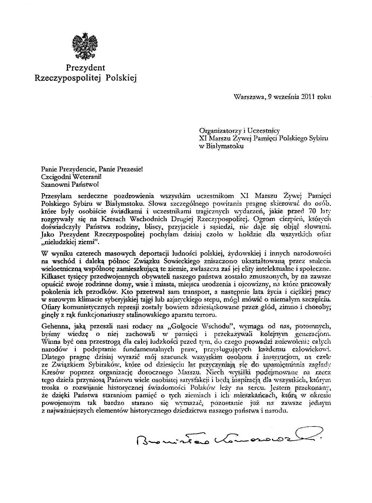 List Prezydenta Bronisława Komorowskiego
