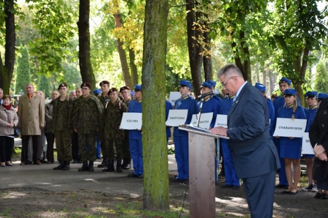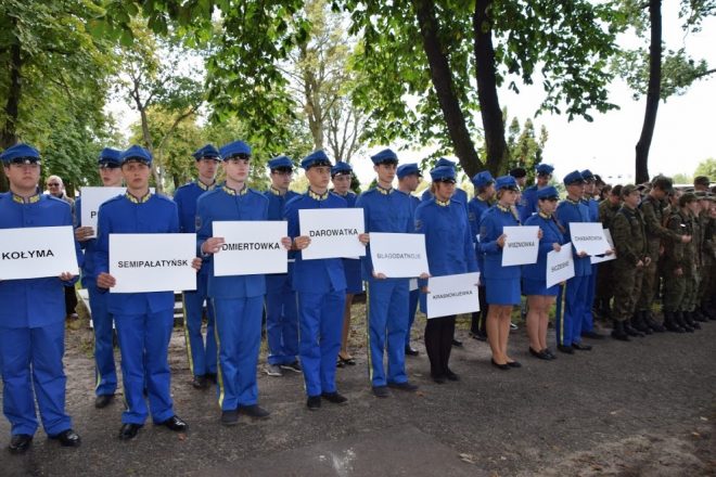 W tym roku Dzień Sybiraka obchodzono pod hasłem: „Ojczyzna w naszych sercach i pamięci”. Ideą uroczystości bowiem jest nie tylko pamięć o tych, którzy przeszli gehennę na „nieludzkiej ziemi”, ale zarażenie młodych ludzi chęcią zgłębiania historii własnej ojczyzny. Uroczystości rozpoczęła konferencja „Odkrywcy historii – syberyjskie zsyłki”, którą 14 września 2017 r. w Urzędzie Marszałkowskim w Toruniu otworzył marszałek województwa Piotr Całbecki. Uczestniczyli w niej historycy, przedstawiciele Związku Sybiraków i młodzież ze szkół noszących imiona Sybiraków z Brodnicy, Grudziądza i Torunia. Wśród licznych wystąpień znalazły się prelekcja prof. Huberta Chudzia z Centrum Dokumentacji Zsyłek, Wypędzeń i Przesiedleń w Krakowie oraz wykład Michała Antonowicza z Uniwersytetu Mikołaja Kopernika w Toruniu, który mówił o polskiej diasporze w zachodniej Syberii. Swoimi wspomnieniami podzielili się też Sybiracy: Ludmiła Ośnicka i Stanisław Dubiel. Uczestnicy konferencji uczestniczyli także w otwarciu wystawy „Sybiracy wczoraj i dziś”. Główne uroczystości z okazji Dnia Sybiraka miały miejsce 15 września. W godzinach przedpołudniowych w lesie na Barbarce odbyły się zawody pod hasłem „Bieg Sybiraka”, zorganizowane przez Stowarzyszenie Polskich Artylerzystów, Urząd Marszałkowski w Toruniu i Sybiraków z toruńskiego Oddziału ZS. Celem zawodów, w których wzięła udział młodzież z klas o profilu mundurowym, było sprawdzenie wiedzy historycznej oraz poziomu sprawności i umiejętności wojskowych. Niezwykle ciekawym i kształcącym elementem zawodów okazało się wykonywanie, pod nadzorem Sybiraków, czynności i prac zbliżonych do tych z zesłań. O godz. 13 w kościele pw. Miłosierdzia Bożego i św. Faustyny odprawiona została uroczysta msza święta celebrowana przez ks. prałata Józefa Nowakowskiego, kapelana Sybiraków. W mszy uczestniczył także ks. mitrat płk Mikołaj Hajduczenia z prawosławnej parafii w Toruniu. Oprawę liturgiczną zapewnili Sybiracy, a muzyczną – Toruński Chór Nauczycielski „Con Anima” pod dyrekcją Janusza Heyki. Po mszy uczestnicy w Toruńskim Marszu Pamięci Sybiru przeszli na Cmentarz Komunalny im. Ofiar II Wojny Światowej, gdzie przy obelisku Sybiraków odbyła się dalsza część uroczystości. Przybyłych powitał prezes Zarządu toruńskiego Oddziału ZS Jan Myrcha. Swą obecnością obchody Dnia Sybiraka uświetnili: Sybiracy, prezydent Torunia Michał Zaleski wraz z przewodniczącym Rady Miasta Torunia Marcinem Czyżniewskim, pełnomocnik Zarządu Urzędu Marszałkowskiego ds. kombatantów i osób represjonowanych Marcin Swaczyna, kierownik Biura Obronności i Bezpieczeństwa Publicznego Urzędu Marszałkowskiego Eugeniusz Lala, wicestarosta toruński Andrzej Siemianowski, dyrektor Zespołu Szkół nr 1 w Toruniu Zbigniew Matuszewicz wraz z uczniami i gronem pedagogicznym, prezes Stowarzyszenia Artylerzystów Polskich Roman Kłosiński, przedstawiciele stowarzyszeń i organizacji pozarządowych, kombatanci, harcerze, media. Uroczystości dopełniła obecność Kompanii Honorowej z CSAiU oraz orkiestry Garnizonu Toruń. W swoim przemówieniu prezes Jan Myrcha zauważył, że obchody tegorocznego Dnia Sybiraka odbywały się pod hasłem: „Ojczyzna w naszych sercach i pamięci”. To hasło niezwykle ważne, bo odnosi się do przeszłości, ale wiąże się też z przyszłością: „Zwykliśmy o nich mówić – Sybiracy. To ludzie dotknięci wielką traumą, jaką zawsze jest rozłąka z bliskimi, samotność i praca w nieludzkich warunkach. Wywózki na Sybir były traumą zarówno w wymiarze osobistym, jak i narodowym. Zesłani na Syberię musieli opuścić ojczystą ziemię i próbować odnaleźć się w niegościnnej ziemi, we wrogim otoczeniu i wśród surowej przyrody. Znając ich losy, zawsze będziemy zadawać sobie pytanie – skąd znaleźli w sobie dość siły i nadziei, aby przetrwać. Bardzo wielu nie przetrwało, nigdy nie wrócili do Polski. Ich mogiły zostały na obcej syberyjskiej ziemi. Ci, którym udało się wrócić, na zawsze będą nosić w sobie wspomnienie tego okrutnego doświadczenia. Ten straszny los spotkał setki tysięcy Polaków. O Sybirakach mówi się »zagubione pokolenia narodu polskiego«. Ojczyzna bezpowrotnie utraciła swoich obywateli, a oni utracili ojczyznę. Zsyłki na Syberię były dziełem bezdusznych rosyjskich tyranii. Najpierw autorytarnego caratu, potem brutalnego Związku Sowieckiego. Obydwa te systemy za nic miały ludzką godność i potrzebę wolności. Polacy przez wieki płacili najwyższą cenę za opór i próby walki z tyranią”. Na zakończenie prezes Jan Myrcha podkreślił, że naszym obowiązkiem jest pamięć o tragicznym losie Sybiraków, ale też przekazywanie tej wiedzy następnym pokoleniom Polaków z pełną świadomością, że jest to bardzo bolesna lekcja. Następnie prezes Myrcha uhonorował przewodniczącego Rady Miasta Torunia Marcina Czyżniewskiego Odznaką Honorową Sybiraka i podziękował władzom miasta i województwa za wsparcie i pomoc, jakiej udzielają Sybirakom. W dalszej części aktor Dariusz Bereski odczytał Apel Sybiraków, po którym nastąpiło złożenie wieńców i zniczy pod obeliskiem Sybiraków. Wszystkim delegacjom towarzyszyli uczniowie klas mundurowych VI Liceum Ogólnokształcącego im. Zesłańców Sybiru w Toruniu. Na zakończenie wspólnie odśpiewano Hymn Sybiraków, a prezes Myrcha serdecznie podziękował wszystkim za obecność. Kompania Honorowa Wojska Polskiego i poczty sztandarowe podczas Toruńskiego Marszu Żywej Pamięci Polskiego Sybiru Toruński Marsz Żywej Pamięci Polskiego Sybiru Młodzież z VI LO im. Zesłańców Sybiru w Toruniu trzymająca podczas uroczystości kartki z nazwami miejsc zesłań Prezes Zarządu toruńskiego Oddziału ZS Jan Myrcha podczas wystąpienia przy obelisku Sybiraków Sybiracy z prezesem Janem Myrc