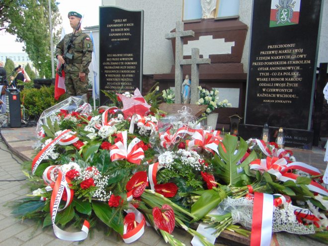 W dniu 18 września 2017 r. w Głogowie odbyły się uroczystości związane z 78. rocznicą napaści Związku Sowieckiego na Polskę. Obchody rozpoczęły się uroczystą mszą w intencji Sybiraków, a po niej zaczęła się część patriotyczna uroczystości. Jak co roku udział w obchodach wzięli posłowie, przedstawiciele lokalnych władz samorządowych, gminnych, służb mundurowych, związków kombatanckich, stowarzyszeń, zakładów pracy, partii politycznych oraz licznie przybyłe szkoły. Uroczystość uświetnił występ uczennic ze Szkoły Podstawowej nr 3 w Głogowie, które przygotowała Tamara Chojnacka. W czasie uroczystości został uhonorowany Złotą Odznaką Honorową za Zasługi dla Związku Sybiraków Stanisław Dwojny – prezes Zarządu Koła Związku Sybiraków w Głogowie. Odznaczenia honorowe otrzymali również starosta głogowski Jarosław Dudkowiak oraz Aneta Skrzypczak. Odznaczenia wręczała Wanda Puchała – wiceprezes Zarządu Oddziału Związku Sybiraków w Legnicy. Przedstawiciele władz i służb mundurowych Uroczystość zgromadziła wielu Sybiraków i mieszkańców Głogowa Poczty sztandarowe Wręczenie odznaczeń. Wyróżnieni (od lewej): prezes Zarządu Koła Stanisław Dwojny, starosta głogowski Jarosław Dudkowiak i Aneta Skrzypczak. Przemawia wiceprezes Zarządu Oddziału ZS w Legnicy Wanda Puchała Występ uczennic ze Szkoły Podstawowej nr 3 w Głogowie Ceremonia złożenia kwiatów pod pomnikiem Zesłańców Sybiru Autor: Aneta Skrzypczak Przeczytano 26 Nawigacja wpisu Dzień Sybiraka w Jastrzębiu-Zdroju Uroczystość Dnia Sybiraka w Kole nr 8 w Zielonej Górze