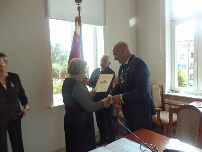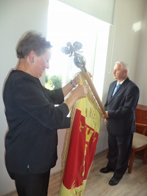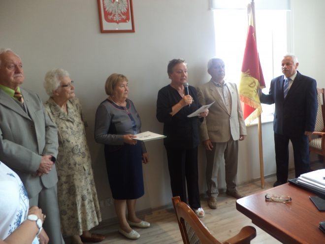 Na obrady sesji Rady Miejskiej przybyli w dniu 31 sierpnia 2017 r. Sybiracy reprezentujący Zarząd Oddziału Związku Sybiraków w Gorzowie Wielkopolskim – prezes Jadwiga Ostrowska wraz z zastępcą Wincentym Hubskim oraz przedstawiciele Zarządu Koła Związku Sybiraków w Dębnie – Teresa Wiśniewska, Jadwiga Downar, Henryk Górewicz i Helena Siemaszko. Przewodniczący Rady Miejskiej Paweł Chrobak przedstawił przybyłych gości, po czym udzielił głosu prezes Jadwidze Ostrowskiej. Prezes przedstawiła historię Koła, założonego – po reaktywowaniu w 1988 r. przedwojennego Związku Sybiraków – 9 września 1989 r., gdy grupa 34 osób ukonstytuowała Zarząd Koła z prezesem Ryszardem Czaszką na czele. Wspomniała nieodżałowanych prezesów śp. Jadwigę Sabeł i Jana Krawca. Opisała 28-letnią działalność Koła, która poza pomocą w uzyskaniu przez Sybiraków uprawnień kombatanckich, organizacją uroczystości związkowych i opłatkowych, troską o członków stowarzyszenia, obejmowała także utrwalanie działalności dla przyszłych pokoleń poprzez różne znaki pamięci w postaci pomnika Sybiraków, sztandaru, tablic pamiątkowych w kościołach, nazwy ronda oraz wydawnictwa, które samymi tytułami wskazują na troskę pamięci o zesłanych: „Utrwalone w pamięci”, „By czas nie zatarł w pamięci”, „Ocaleni od zapomnienia”. Koło nawiązało ścisłą współpracę ze środowiskami kombatanckimi, Kościołem, szkołami i przedszkolami oraz innymi instytucjami miejskimi, w tym z Radą Miejską. Dębnowscy Sybiracy, wdzięczni za długoletnie wspieranie ich działalności, szczególną opiekę i troskę o ich społeczną pracę, z prawdziwą satysfakcją przyjęli decyzję Zarządu Głównego odznaczenia Rady Miasta Dębna Złotą Odznaką Honorową za Zasługi dla Związku Sybiraków. Następnie prezes Zarządu Oddziału w Gorzowie Wielkopolskim Jadwiga Ostrowska dokonała uroczystego aktu dekoracji sztandaru Rady Miejskiej Złotą Odznaką Honorową za Zasługi dla Związku Sybiraków, a wiceprezes Zarządu Koła Teresa Wiśniewska wręczyła dyplom odznaki. Uroczystość wręczenia odznaki odbyła się w trakcie obrad Rady Miasta. W trakcie uroczystości obecni byli: przewodniczący Rady Miasta Paweł Chrobak, zastępca Adam Kaczmarczyk i radny Jan Sypniewicz, a także burmistrz Piotr Downar oraz radni. Po zakończeniu obrad Rady Miejskiej radni, włodarze miasta i delegacja Sybiraków spotkali się na uroczystym obiedzie. Delegacja Sybiraków. Przemawia prezes Zarządu Oddziału w Gorzowie Wielkopolskim Jadwiga Ostrowska Jadwiga Ostrowska dokonuje dekoracji sztandaru Rady Miejskiej Złotą Odznaką Honorową za Zasługi dla Związku Sybiraków Wiceprezes Zarządu Koła Teresa Wiśniewska wręcza przewodniczącemu Rady Miejskiej Pawłowi Chrobakowi dyplom odznaki Autor: Teresa Wiśniewska, zdjęcia Adam Kaczmarczyk Przeczytano 172 Nawigacja wpisu Wycieczka z Białorusi w Białymstoku XVII Międzynarodowy Marsz Pamięci Zesłańców Sybiru w Białymstoku