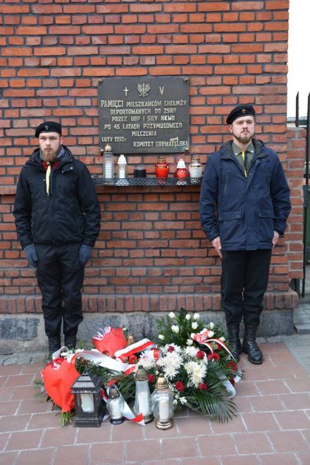 Obchody rocznicowe 73. rocznicy wywózki chełmżan na Sybir wspólnie zorganizowali: burmistrz miasta Chełmży, chełmżyńscy Sybiracy (Oddział ZS w Toruniu) oraz Biblioteka Publiczna Powiatowa i Miejska im. Juliana Prejsa w Chełmży. Pamięć o nich uczczono w piątek 2 marca 2018 r. Uroczystości rocznicowe rozpoczęła msza święta w bazylice Świętej Trójcy. Następnie zebrani przeszli pod tablicę pamiątkową umieszczoną na budynku przy ul. Sądowej, obecnie siedzibie komisariatu policji. Tam złożono kwiaty oraz znicze. Na koniec w Bibliotece Publicznej Powiatowej i Miejskiej odbyła się projekcja filmu Franciszka Kuczki pt. „Miejsca pamięci w Chełmży”. Udział w uroczystościach wzięli: burmistrz Jerzy Czerwiński, zastępca burmistrza Marek Kuffel, przewodniczący Rady Miejskiej Janusz Kalinowski, wiceprzewodnicząca Rady Miejskiej Małgorzata Polikowska, ks. kanonik Krzysztof Badowski, pełnomocnik ds. kombatantów i osób represjonowanych Urzędu Marszałkowskiego w Toruniu Marcin Swaczyna, prezes Zarządu Oddziału Związku Sybiraków w Toruniu Jan Myrcha, dyrektor Zespołu Szkół nr 1 im. Zesłańców Sybiru w Toruniu Zbigniew Matuszewicz, prezes Zarządu Koła Rodzin Sybiraków w Golubiu-Dobrzyniu Ewa Kaźmierkiewicz, dyrektor Miejskiej i Powiatowej Biblioteki Publicznej w Golubiu-Dobrzyniu Barbara Wasiluk, członkowie szkolnych społeczności z Chełmży – dyrektorzy szkół oraz uczniowie, harcerze, przedstawiciele ogrodów działkowych oraz liczni mieszkańcy miasta. Leszek Masłowski, ostatni żyjący świadek tragicznych wydarzeń sprzed 73 lat, którym poświęcił autobiograficzną książkę „Zraniona młodość. Wspomnienia Sybiraka”, z powodu złego stanu zdrowia nie mógł wziąć udziału w uroczystościach. 90-letni Leszek Masłowski został właśnie wyróżniony Medalem Marszałka Województwa Unitas Durat Palatinatus Cuiaviano-Pomeraniensis, który jest najwyższym regionalnym odznaczeniem. Uroczystość wręczenia medalu zasłużonemu Sybirakowi odbyła się tuż przed chełmżyńskimi obchodami w Domu Pomocy Społecznej w Browinie, gdzie Leszek Masłowski obecnie przebywa. Uroczysty przemarsz ulicami Chełmży Poczty sztandarowe Kwiaty pod tablica pamiątkową składają burmistrz Jerzy Czerwiński (z lewej) i przewodniczący Rady Miejskiej Janusz Kalinowski Przedstawiciele Sybiraków z kwiatami W uroczystości udział wzięli Sybiracy, przedstawiciele władz miasta, młodzież oraz mieszkańcy Tablica pamiątkowa poświęcona chełmżanom wywiezionym na Sybir Autor: Urszula Meszyńska, dyrektor Biblioteki Publicznej Powiatowej i Miejskiej im. Juliana Prejsa w Chełmży Przeczytano 71 Nawigacja wpisu Uroczysta akademia w Szkole Podstawowej nr 4 im. Sybiraków w Białymstoku 74. rocznica mordu w Hucie Pieniackiej