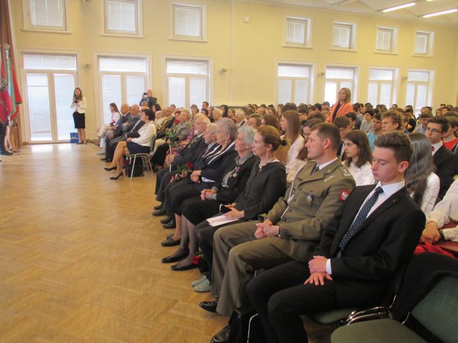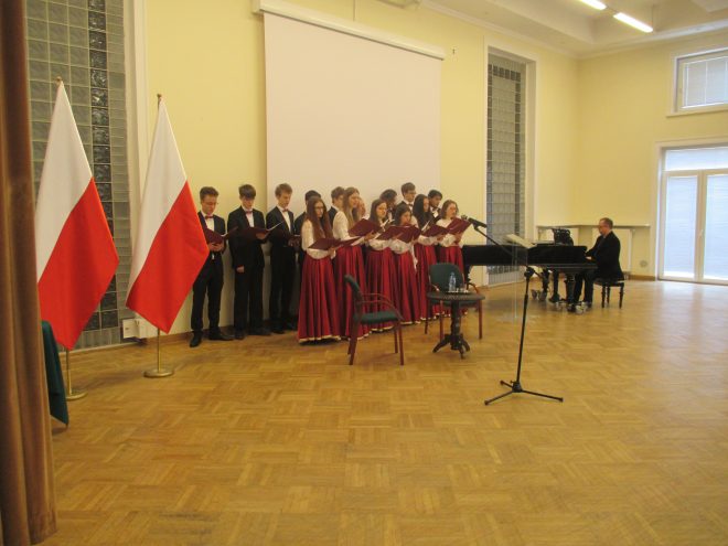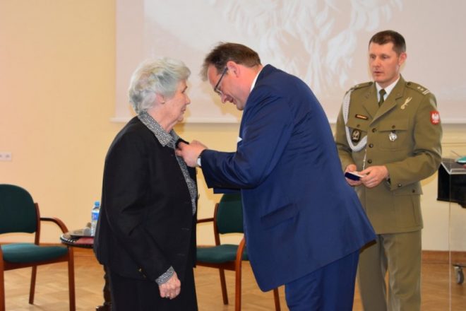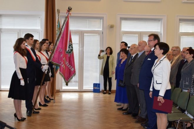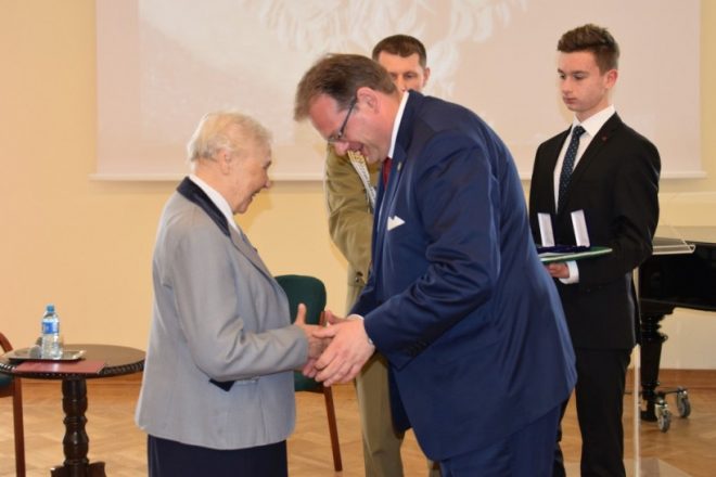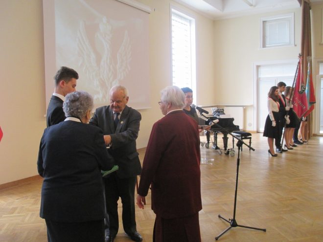 Jednym z najważniejszych zadań, jakie podejmują zesłańcy na Sybir jako świadkowie trudnej historii, jest przekazywanie wiedzy o wydarzeniach z przeszłości, wspomnień i osobistych doświadczeń młodemu pokoleniu, gdyż to ono w przyszłości kształtować będzie losy kraju i wpływać na jego historię. Przekazywanie tradycji narodowych i kształtowanie postawy obywatelskiej i patriotycznej ma więc ogromne znaczenie. Z tej okazji dnia 11 kwietnia 2018 r. w XIV Liceum Ogólnokształcącym im. S. Staszica w Warszawie odbyło się spotkanie młodzieży z Sybirakami dzielnicy Ochota. Przygotowane pod hasłem „Sybiracy w walce o wolną i suwerenną Polskę”, związane było z obchodami setnej rocznicy odzyskania przez Polskę niepodległości oraz 90. rocznicą powstania Związku Sybiraków. Jego organizatorami byli Rada i Zarząd Dzielnicy Ochota m.st. Warszawy, Zarząd Koła Związku Sybiraków Warszawa-Ochota oraz XIV Liceum Ogólnokształcące im. S. Staszica. Udział wzięli m.in. szef Urzędu ds. Kombatantów i Osób Represjonowanych i wiceprzewodniczący Rady Dzielnicy Ochota Jan Józef Kasprzyk, przedstawiciele władz dzielnicy z burmistrz Katarzyną Łęgiewicz, a ze strony władz Związku Sybiraków wiceprezes Zarządu Głównego Mieczysław Pogodziński, członek Zarządu Głównego i wieloletnia prezes Zarządu Koła Warszawa-Ochota Maria Markiewicz, reprezentanci Zarządu Oddziału z prezesem Stanisławem Sikorskim oraz prezes Zarządu Koła Zofia Pogodzińska, a także dyrekcja szkoły. Po wprowadzeniu pocztów sztandarowych szkoły i Oddziału Warszawskiego ZS, Chór XIV LO odśpiewał Hymn Sybiraków. Okolicznościowe przemówienia rozpoczęła burmistrz Katarzyna Łęgiewicz. Wyraziła podziw dla Sybiraków i oddała im hołd za hart ducha, zachowanie polskości, godności i nadziei na powrót do wolnej ojczyzny mimo doświadczenia okrucieństwa i wielu upokorzeń na zesłaniu. Spotkanie z młodzieżą stało się okazją do wyrażenia Sybirakom wdzięczności za ich patriotyzm, bohaterstwo i wieloletnią działalność na rzecz upamiętniania historii i przekazywania wartości. Szef Urzędu ds. Kombatantów i Osób Represjonowanych Jan Józef Kasprzyk odznaczył medalem Pro Patria zasłużonych działaczy: Lesława Chmiela, Lucynę Kalinowską, Wiktora Olaka, Ireneusza Piotrowskiego i księżną Nicole Radziwiłł. W imieniu prezesa Zarządu Głównego Związku Sybiraków wiceprezes Mieczysław Pogodziński w asyście Marii Markiewicz wręczył Odznaki Honorowe za Zasługi dla Związku Sybiraków Izabeli Piecuch, Krystynie Ożdze, Mai Rawie oraz Krystynie Zarębie. Szef UdsKiOR Jan Józef Kasprzyk podkreślił znaczenie żywych lekcji historii z udziałem Sybiraków oraz ich wkład w zachowanie ducha narodowego podczas zaborów i w XX w., w walkach o niepodległość, a następnie o suwerenność ojczyzny. Nikt tak dobrze jak zesłańcy nie wie, że niepodległość jest najwyższym darem Opatrzności, a jej utrata najgorszym doświadczeniem. Nawiązał do 90. rocznicy założenia Związku Sybiraków i zapowiedział odsłonięcie w czerwcu br. na Politechnice Warszawskiej tablicy upamiętniającej to wydarzenie. Mieczysław Pogodziński i Maria Markiewicz w imieniu Związku Sybiraków podziękowali dyrektor liceum Reginie Lewkowicz za zaproszenie, wręczając trzytomową „Księgę Sybiraków”. Podziękowania złożyła również pani burmistrz. Po wyprowadzeniu sztandarów wiceprezes Mieczysław Pogodziński wygłosił prelekcję na temat zsyłek i wkładu zesłańców w walkę o niepodległość Polski, zakończoną pokazem filmu „Udział Żołnierzy Sybiraków na frontach II wojny światowej”. Warto przypomnieć, że Sybiracy sformowani w 5. Dywizję Syberyjską brali udział w walkach z Armią Czerwoną w latach 1919–1920, w tym w bitwie warszawskiej, podczas II wojny światowej z gen. Władysława Andersem uczestniczyli w kampanii włoskiej, zdobywając m.in. Monte Cassino, a w 1. Dywizji Piechoty im. T. Kościuszki przeszli szlak bojowy od Lenino do Berlina. W części artystycznej na zakończenie uroczystości wystąpił Chór XIV LO im. S. Staszica. Młodzież i dyrekcja XIV Liceum Ogólnokształcącego im. S. Staszica, Sybiracy oraz zaproszeni goście W pierwszym rzędzie (od prawej): burmistrz dzielnicy Warszawa-Ochota Katarzyna Łęgiewicz, szef UdsKiOR Jan Józef Kasprzyk, przewodniczący Rady Dzielnicy Witold Dzięciołowski, zastępca burmistrza Grzegorz Wysocki, wiceprezes Zarządu Głównego ZS Mieczysław Pogodziński, prezes Zarządu Koła ZS Warszawa-Ochota Zofia Pogodzińska Wśród działaczy odznaczonych przez szefa UdsKiOR Jana Józefa Kasprzyka medalem Pro Patria były Lucyna Kalinowska (u góry) i Nicole Radziwiłł Wiceprezes Mieczysław Pogodziński wraz z Marią Markiewicz wręczyli Odznaki Honorowe za Zasługi dla Związku Sybiraków. Uhonorowana została m.in. Izabela Piecuch Chór XIV LO im. S. Staszica wykonał pieśni patriotyczne Autor: Beata Żyłkowska, zdjęcia Urząd Dzielnicy Ochota, Urząd ds. Kombatantów i Osób Represjonowanych Przeczytano 78 Nawigacja wpisu Dzień Patrona w Zespole Szkół Handlowych w Jastrzębiu-Zdroju Kwiecień – miesiąc Golgoty Wschodu w Białymstoku