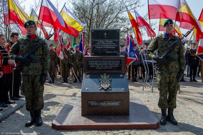 Obchody tych tragicznych rocznic, w których uczestniczyli Sybiracy, rozpoczęły się w Białymstoku 11 kwietnia 2018 r. spotkaniem w Szkole Podstawowej nr 34. Wiodącym mottem było hasło – „Ojczyznę ma ten, kto ją w sercu nosi” i cały program słowno-muzyczny był temu podporządkowany. Młodzi wykonawcy rozpoczęli swoje wystąpienie odśpiewaniem Hymnu Sybiraków, a następnie dyrektor szkoły Jerzy Bołtuć w krótkich słowach przekazał istotę patriotyzmu i umiłowania ojczyzny w dzisiejszych czasach. Minutą ciszy uczciliśmy tych, którzy ponieśli ofiarę życia – zesłańców z okresu kwietniowej deportacji, ofiary Katynia i katastrofy smoleńskiej z 2010 r. Prezes Zarządu Oddziału ZS w Białymstoku Tadeusz Chwiedź w swoim wystąpieniu przekazał, jak ważną rolę odgrywa znajomość historii swego narodu i jak to określa tożsamość każdego jej obywatela. Złożenie kwiatów na dziedzińcu szkolnym pod głazem – pomnikiem poświęconym ofiarom Katynia zakończyło tę podniosłą uroczystość. Kolejna uroczystość zorganizowana przez Urząd Miasta Białegostoku i Związek Sybiraków miała miejsce 12 kwietnia br. przy dworcu PKP Białystok Fabryczny, skąd w latach 1940–1941 wywożono tysiące obywateli polskich na Syberię i do Kazachstanu. Na odsłanianym w tym dniu obelisku oprócz ww. informacji znajduje się również druga tablica o treści: „W latach 1940–1941 władze Związku Sowieckiego przeprowadziły cztery masowe akcje deportacyjne z Kresów Wschodnich II RP; w lutym, kwietniu i czerwcu 1940 r. oraz w maju i czerwcu 1941 r. Wywózki trwały do 1956 r.”. Poniżej obu tablic godło Związku Sybiraków wieńczy całość tego znaku pamięci. Punktualnie o godz. 12 w południe, przy biciu dzwonów z pobliskiego kościoła, nastąpiło poświęcenie obelisku i wspólna modlitwa ekumeniczna kapelanów wojskowych. W przemówieniu prezes Zarządu białostockiego Oddziału Związku Sybiraków Tadeusz Chwiedź nakreślił przyczyny i skutki gehenny Polaków, które dotknęły zesłańców na „nieludzkiej ziemi”. Przypomniał, że dworzec był tym miejscem, na którym deportowani po raz ostatni postawili stopy na ojczystej ziemi, nie znając swojej dalszej przyszłości. Bardzo znamiennym faktem było uroczyste przekazanie „Aktu powierzenia” – przekazanie pod opiekę nowo wybudowanego monumentu i jego otoczenia społeczności szkolnej – Szkole Podstawowej nr 8 im. Kazimierza Królewicza w Białymstoku. Akt ten zawierał również nasze obowiązki jako Sybiraków – uczestnictwo w uroczystościach patriotycznych organizowanych przez szkołę, jak również przekazywanie wiedzy historycznej na temat zesłań XX w. Obelisk wybudowany został własnym sumptem przez Związek Sybiraków i dzięki pomocy życzliwych ludzi, którym prezes Zarządu białostockiego Oddziału Związku Sybiraków serdecznie podziękował. Na zakończenie tej wspaniałej patriotycznej uroczystości nastąpiło złożenie kwiatów i zapalenie zniczy. Wspaniała pogoda, liczne poczty sztandarowe, duża liczba uczestników, a szczególnie młodzieży, w niczym nie przypominały tego tragicznego dnia z 1940 r. Kolejne obchody pamiętnej rocznicy kwietniowej deportacji miały miejsce przy pomniku Grobie Nieznanego Sybiraka w Białymstoku w dniu 13 kwietnia. Modlitwa kapelana ks. Józefa Wiśniewskiego oraz krótkie wystąpienie prezesa Zarządu Oddziału Związku Sybiraków Tadeusza Chwiedzia przywołały w naszej pamięci obraz tych tragicznych wydarzeń sprzed 78 lat. Obecność władz samorządowych, przedstawicieli służb mundurowych, IPN, Muzeum Pamięci Sybiru, warty honorowe przy pomniku, zapalony duży znicz oraz poczty sztandarowe podniosły rangę tej uroczystości. Tego samego dnia miało miejsce uczczenie ofiar zbrodni katyńskiej przy Pomniku Katyńskim. Została odczytana uchwała Sejmu o ustanowieniu dnia 13 kwietnia Dniem Pamięci Ofiar Zbrodni Katyńskiej, a następnie minutą ciszy oddaliśmy hołd ofiarom ludobójstwa. Obecność wielu pocztów sztandarowych, szczególnie szkolnych, pozwala mieć nadzieję, że ofiara poniesiona na ołtarzu ojczyzny nie będzie zapomniana. Ceremoniał złożenia kwiatów i wieńców zakończył tę patriotyczną uroczystość. Największe wzruszenie wywołała uroczystość upamiętnienia rocznicy drugiej deportacji i stulecia odzyskania niepodległości w Szkole Podstawowej im. Sybiraków w Rafałówce. Ta mała, podbiałostocka szkoła przedstawiła program pod hasłem „Bo wolność krzyżami się mierzy”, w którym w znakomity sposób przeplatały się wszystkie wątki patriotyczne i wyzwoleńcze, a młodzi artyści z klas II i III zadziwiali swoim perfekcjonizmem. Montaż słowno-muzyczny dał cały przekrój naszych zmagań o odzyskanie niepodległości i walki o przetrwanie zesłańców na wygnaniu. Zabierając głos, prezes Tadeusz Chwiedź przybliżył los dzieci na zesłaniu i współczesne pojęcie patriotyzmu i miłości do ojczyzny, przytaczając wiersze sybiraka Mariana Jonkajtysa i wiersz o Synu Pułku. Wszystkie te spotkania o charakterze patriotycznym zapadły głęboko w pamięć zarówno starszego pokolenia, jak i biorącej w nich udział młodzieży. Obelisk przy dworcu PKP Białystok Fabryczny (fot. UM Białystok/Dawid Gromadzki) Autor: Jolanta Hryniewicka, sekretarz Zarządu Oddziału ZS w Białymstoku Przeczytano 32 Nawigacja wpisu Sybiracy w walce o wolną i suwerenną Polskę 78. rocznica zbrodni katyńskiej w Słupsku