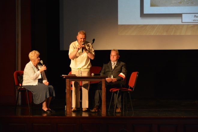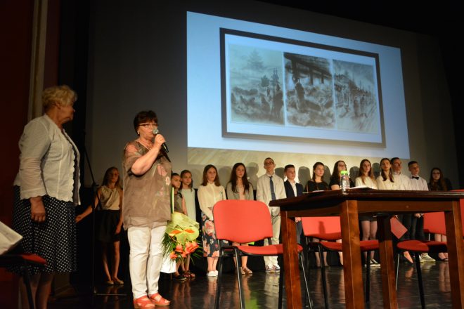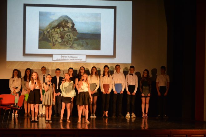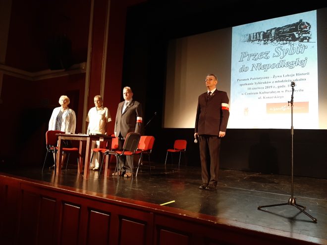 Pod takim tytułem 10 czerwca 2019 r. odbył się pierwszy z dwóch zaplanowanych „Poranków Patriotycznych” – spotkań Sybiraków z młodzieżą. Słuchaczami i widzami pierwszego „Poranka” byli uczniowie szkół podstawowych Przemyśla i powiatu przemyskiego. Założeniem spotkania było upamiętnienie losów zesłańców Sybiru oraz ich udziału w dążeniach do odzyskania niepodległości Polski. Spotkanie otworzył Marian Boczar – sekretarz Zarządu Oddziału Związku Sybiraków w Przemyślu, witając przybyłych i wprowadzając w tematykę spotkania „Przez Sybir do Niepodległej”. Po zaproszeniu na scenę przedstawicieli Sybiraków z przemyskiego Oddziału ZS – Stanisławy Żak – prezes Zarządu Oddziału ZS, Antoniego Blecharczyka i Mieczysława Tłuczka, zgromadzeni w postawie stojącej wysłuchali Hymnu Sybiraków. Dalszą część spotkania poprowadziła Stanisława Żak. Zaprezentowano wspomnienia zesłańców, które były wprowadzeniem do filmu „Na nieludzką ziemię”, zrealizowanego na podstawie wspomnień przemyskich Sybiraków w rekonstrukcji historycznej, która odbyła się 28 lutego 2010 r. Bezpośrednio po filmie Marian Boczar przedstawił historię powstania i działalności Związku Sybiraków, a uczniowie Szkoły Podstawowej nr 15 im. A. Mickiewicza w Przemyślu – współorganizatora „Poranka” – pod opieką nauczycieli Marcina Dumy, Moniki Góruk i Łukasza Cebeńko zaprezentowali program słowno-muzyczny mówiący o zesłaniach na Sybir na przestrzeni wieków. Podsumowaniem spotkania była historia żołnierzy – Sybiraków i ich udziału w odzyskaniu przez Polskę niepodległości. W krótkim wystąpieniu przypomniano o żołnierzach Sybirakach i ich walkach o wolną ojczyznę, zaczynając od historii 5. Dywizji Syberyjskiej, Samodzielnego Korpusu Kaukaskiego, przez armię gen. Władysława Andersa oraz I Dywizję Piechoty im. Tadeusza Kościuszki utworzoną w Sielcach nad Oką. Honorowymi gośćmi byli Sybiracy oraz przedstawiciele władz miejskich. Spotkanie z młodzieżą dofinansowano ze środków Programu Wieloletniego NIEPODLEGŁA na lata 2017–2022 w ramach Programu Dotacyjnego „Niepodległa”. Współorganizatorami spotkania byli: Oddział Związku Sybiraków w Przemyślu, Centrum Kulturalne w Przemyślu, Szkoła Podstawowa nr 15 im. A. Mickiewicza w Przemyślu. Rozpoczynający spotkanie Marian Boczar oraz (od lewej) Stanisława Żak, Mieczysław Tłuczek, Antoni Blecharczyk W spotkaniu udział wzięli Sybiracy, przedstawiciele Urzędu Miejskiego w Przemyślu i sympatycy Związku Sybiraków. W dalszych rzędach młodzież szkół podstawowych. Od lewej: Stanisława Żak, Mieczysław Tłuczek, Antoni Blecharczyk Występ uczniów Szkoły Podstawowej nr 15 im. A. Mickiewicza w Przemyślu Od lewej Stanisława Żak – prezes Zarządu Oddziału Związku Sybiraków w Przemyślu i Maria Młynarska – wicedyrektor Szkoły Podstawowej nr 15 im. A. Mickiewicza w Przemyślu Przedstawiciele Urzędu Miejskiego w Przemyślu, przedstawiciele Oddziału Związku Sybiraków w Przemyślu, grono pedagogiczne i uczniowie Szkoły Podstawowej nr 15 im. Adama Mickiewicza Autor: Stanisława Żak, prezes Zarządu Oddziału ZS w Przemyślu, zdjęcia Marian Boczar, sekretarz Zarządu Oddziału ZS w Przemyślu Przeczytano 24 Nawigacja wpisu Uroczystość w Zaciszu koło Białegostoku Aby się Sybir nigdy nie powtórzył!