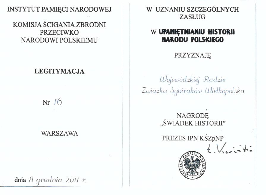 W pięknej auli im. Lubrańskiego na Uniwersytecie im. Adama Mickiewicza w Poznaniu w dniu 8 grudnia 2011 r. odbyła się uroczystość. Już po raz drugi Instytut Pamięci Narodowej, Wydział Historii UAM oraz ZZ „Solidarność” postanowiły wręczyć instytucjom i osobom fizycznym medale za krzewienie pamięci historycznej pod nazwą „Świadek Historii”. Zaproszono wielu znanych w Wielkopolsce i w samym Poznaniu przedstawicieli życia politycznego i świata nauki, a także młodzieży akademickiej. Swoją obecnością uroczystość zaszczycił Wojewoda Wielkopolski Piotr Florek. Przed wręczeniem medali wykład wygłosił prof. Karol Olejnik. Wśród odznaczonych znalazła się Wojewódzka Rada Związku Sybiraków Wielkopolska. To zaszczytne wyróżnienie odebrał przewodniczący Rady i prezes Oddziału w Poznaniu Józef Bancewicz. Nagroda „Świadek Historii” dla Wojewódzkiej Rady Związku Sybiraków Wielkopolska Przewodniczący Rady Wojewódzkiej Józef Bancewicz odbiera z rąk dyrektora Oddziału Wojewódzkiego IPN dyplom i medal „Świadek Historii”. Na zdjęciu od lewej: Marian Macutkiewicz (Koło Grunwald), Irena Górska-Zajączkowska (Zastępca Prezesa Koła Grunwald), Bronisława Halik (Koło Grunwald), Zdzisław Tomasik (Prezes Koła Jeżyce) Na zdjęciu od lewej: Marian Macutkiewicz (Koło Grunwald), Irena Górska-Zajączkowska (Zastępca Prezesa Koła Grunwald), Bronisława Halik (Koło Grunwald), Jerzy Ziółkowski (Koło Jeżyce, Sekretarz Oddziału) Oprac.: Zdzisław Tomasik, Prezes Koła Jeżyce Przeczytano 85 Nawigacja wpisu Sybirak Jerzy Lewicki z wizytą na Syberii Spotkanie opłatkowe Wojewódzkiej Rady Związku Sybiraków w Katowicach