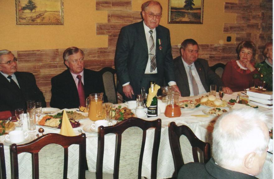 Tradycyjnie już od wielu lat Sybiracy z Koła Poznań Jeżyce i z Nowego Tomyśla spotykają się na uroczystości opłatkowej, tym razem w lokalu Savoy w dniu 17 grudnia 2011 r. Dzięki burmistrzowi Nowego Tomyśla panu Henrykowi Helwingowi w spotkaniu mogli uczestniczyć członkowie „podkoła” z tego pięknego miasta i okolic. Włodarz tego grodu zabezpieczył darmowy transport do i z Poznania. Sam też przyjął z zadowoleniem zaproszenie na opłatek. Donośnie zabrzmiał w wykonaniu 30 uczestników spotkania Hymn Zesłańców Sybiru. Następnie Prezes Koła, a jednocześnie Zastępca Prezesa Zarządu Oddziału Wojewódzkiego Zdzisław Tomasik powitał honorowych gości w osobach Prezesa Zarządu Oddziału Wojewódzkiego Józefa Bancewicza oraz Burmistrza Nowego Tomyśla Henryka Helwinga. Powitał także przyjezdnych Sybiraków z tego miasta oraz wszystkich zebranych członków Koła Jeżyce. Minutą ciszy uczczono zmarłych w tym roku Sybiraków. Prezes zrelacjonował działalność Koła. Prezes Józef Bancewicz w dosyć obszernym wystąpieniu omówił sprawy wiążące się z życiem całego Związku Sybiraków i z oczekiwaniami jego członków na dalsze konstruktywne rozwiązania mające wpływ na polepszenie bytu i stanu zdrowia braci sybirackiej. Jest nadzieja na realizację świadczenia substytucyjnego. Na zakończenie Prezes zarekomendował zebranym zakup książki autorstwa Anne Applebaum pod tytułem „Gułag”. Burmistrz Nowego Tomyśla Henryk Helwing serdecznie podziękował za zaproszenie. Powiedział, że Odznaka Honorowa Sybiraka zobowiązuje do utrzymania i pogłębiania więzi z Sybirakami. W luźnej rozmowie potwierdził, że na pomniku poświęconym ofiarom II wojny światowej, który stanie w Parku Miejskim, znajdzie się odniesienie do ofiar Polaków na „nieludzkiej ziemi”. Życzył wszystkim Sybirakom dobrego zdrowia i pogody ducha. Przebieg spotkania uwieczniła telewizja kablowa z poznańskich Winograd. Wywiadów dla tej stacji udzielili Zdzisław Tomasik oraz Jerzy Ziółkowski. Najważniejszą część spotkania stanowił opłatek. Dzieląc się nim, wszyscy życzyli sobie przede wszystkim zdrowia i doczekania spotkania opłatkowego w tym samym gronie w roku przyszłym. Życzeniom towarzyszyły przepiękne polskie kolędy w wykonaniu polskich artystów, m.in. miejscowej piosenkarki Eleni. Wielce miłym akcentem było poświęcenie czasu Matce Polce, Matce Sybiraczce. Ona to w czasach ciężkiej próby, próby niewolniczej pracy ponad siły, w głodzie i chłodzie zdawała egzamin wytrzymałości. Jak lwica chroniła swoje wygłodzone dzieci. Uczyła ich pacierza i języka ojczystego, uczyła miłości do Ojczyzny. O tym mówili Józef Bancewicz, Konrad Dobrochna, Zofia Głowinkowska oraz Zdzisław Tomasik, który zadeklamował wiersz Ireny Molendy „Matce Sybiraczce”. W niemej ciszy w sercach zebranych utkwiły wzruszające słowa tego wiersza: „Wszędzie było daleko do kraju, do swoich, do nieba a serce krwawo raniły prośby: mamo łyk mleka, dwa kartofelki, mamo daj chleba!…” Trwają intensywne przygotowania do umieszczenia odpowiedniego znaku pamięci poświęconego Matce Sybiraczce i Katyniaczce. Osobne słowa podziękowania należą się gospodyni spotkania Zofii Głowinkowskiej. Dzielenie się opłatkiem i składanie życzeń Burmistrz Nowego Tomyśla Henryk Helwing składa życzenia Sybirakom Prezes Koła Jeżyce Zdzisław Tomasik wita honorowych gości. Na zdjęciu od lewej: Jerzy Ziółkowski, burmistrz Nowego Tomyśla Henryk Helwing, Zdzisław Tomasik, Prezes Zarządu Oddziału Wojewódzkiego ZS Józef Bancewicz, Zofia Głowinkowska Oprac.: Zdzisław Tomasik, Prezes Koła Jeżyce Przeczytano 23 Nawigacja wpisu Spotkanie opłatkowe Wojewódzkiej Rady Związku Sybiraków w Katowicach Spotkanie opłatkowo-noworoczne – Oddział Kielce 7 stycznia 2012 r.