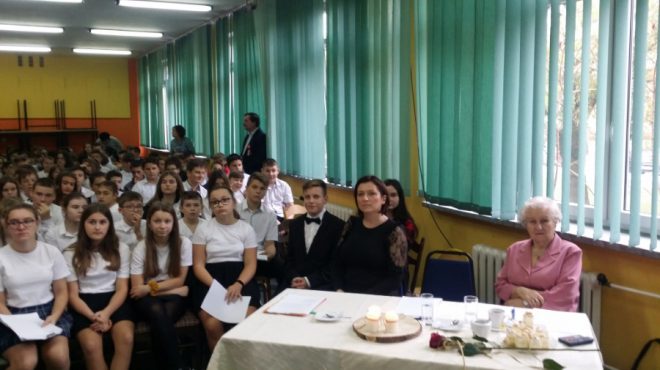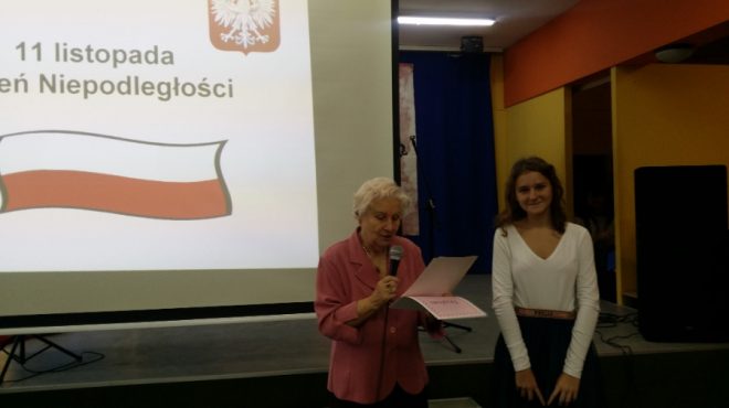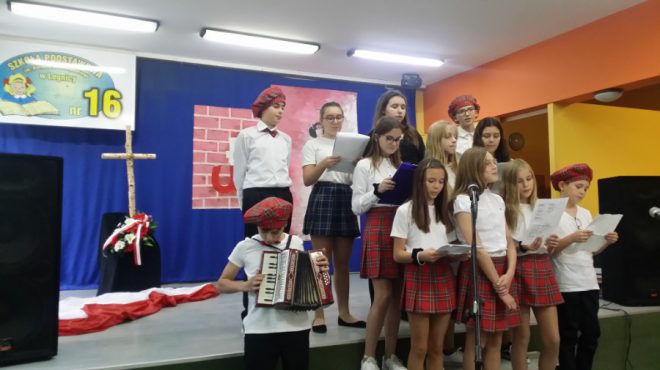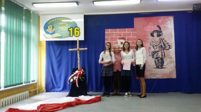 Dzień 8 listopada 2019 r. w Szkole Podstawowej nr 16 w Legnicy był szczególny. Wszyscy uczniowie, ubrani na galowo, wraz z nauczycielami i paniami dyrektor uczestniczyli w uroczystym odśpiewaniu hymnu narodowego o godzinie 11.11. Klasy VII i VIII spotkały się z przedstawicielką Oddziału Związku Sybiraków w Legnicy – Wandą Puchałą, która w ciekawy i poruszający sposób opowiadała młodzieży, jak ważna i cenna jest wolność, jakich cierpień i represji doświadczali Polacy w czasie II wojny światowej na zesłaniu. Wspominała też powojenną rzeczywistość na Ziemiach Odzyskanych. Z kolei klasy V i VI uczestniczyły jako obserwatorzy w Konkursie Pieśni i Poezji Patriotycznej, przygotowanym z wielkim rozmachem, zaangażowaniem i profesjonalizmem przez Monikę Walczak-Szczerbińską i Małgorzatę Surmiak-Daniel. Warto podkreślić niezwykle wysoki poziom wykonania utworów wokalnych, instrumentalnych i recytowanych przez uczniów. Program przygotowany pod kierunkiem obu nauczycielek wywołał wiele wzruszeń i chwilę refleksji nad trudną przeszłością Polski. Zmagania artystyczne młodzieży oceniało jury w składzie: gość honorowy – Wanda Puchała oraz nauczycielka języka polskiego Beata Siek. W obchody pięknie włączyli się uczniowie klas najmłodszych – przygotowali wspaniałą dekorację w holu szkoły ,,Kocham Cię, Polsko” – prace plastyczne prezentujące przywiązanie do Polski i Legnicy – małej ojczyzny. Pięknie też wyglądały dzieci z edukacji wczesnoszkolnej – każde z nich miało biało-czerwony kotylion. To było piękne i niezapomniane święto, które uczniowie Szkoły Podstawowej nr 16 uczcili z wielkim zaangażowaniem i na pewno zapamiętają, jak wielką wagę należy przywiązywać do poczucia tożsamości narodowej, dumy z bycia Polakiem, bo przecież ,,Wolność nie jest dana raz na zawsze. Trzeba ją stale zdobywać na nowo” (Jan Paweł II). Obchody Święta Niepodległości w Szkole Podstawowej nr 16 w Legnicy z udziałem Sybiraczki Wandy Puchały (z prawej) Występ uczniów w Konkursie Pieśni i Poezji Patriotycznej Wiceprezes Zarządu Oddziału Związku Sybiraków w Legnicy Wanda Puchała wręczyła zwycięzcom konkursu dyplomy Wanda Puchała z laureatkami Konkursu Pieśni i Poezji Patriotycznej Autor: Beata Siek, nauczycielka Szkoły Podstawowej nr 16 w Legnicy Przeczytano 30 Nawigacja wpisu Konkurs Piosenki Patriotycznej w Przemyślu „Śpieszmy się kochać ludzi, tak szybko odchodzą…”