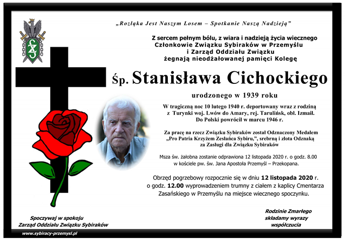 Z głębokim smutkiem i żalem zawiadamiamy, że 8 listopada 2020 r. w wieku 81 lat zmarłśp. Stanisław Cichocki Nieodżałowanej pamięci kolega, członek Oddziału Związku Sybiraków w Przemyślu. Wieloletni skarbnik i członek Zarządu Oddziału, uhonorowany medalem Pro Memoria, Srebrną i Złotą Odznaką za Zasługi dla Związku Sybiraków.Żegnamy go z bólem, zachowując w pamięci jako życzliwego Kolegę i Przyjaciela, na którego zawsze można było liczyć. Cześć Jego pamięciZarząd Oddziału Związku Sybiraków w Przemyślu. Przeczytano 66 Nawigacja wpisu śp. Henryka Czarnik śp. Grażyna Jonkajtys-Luba