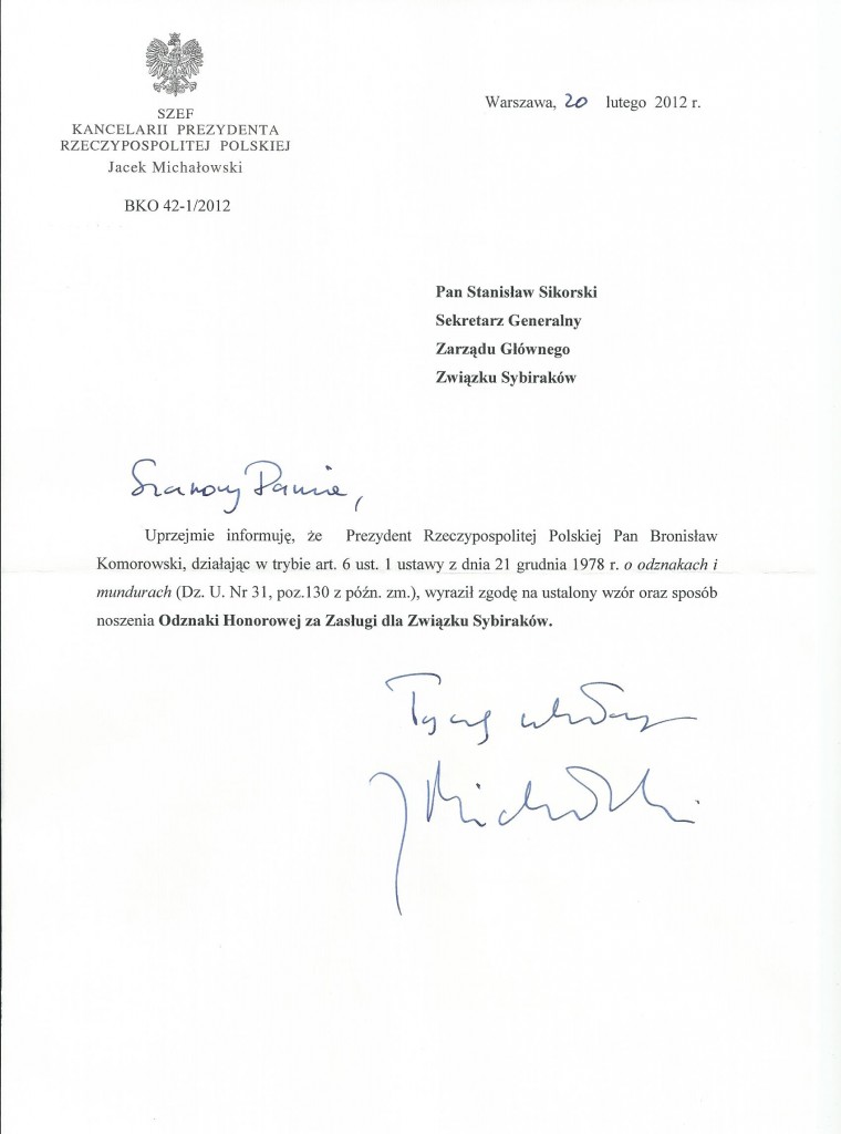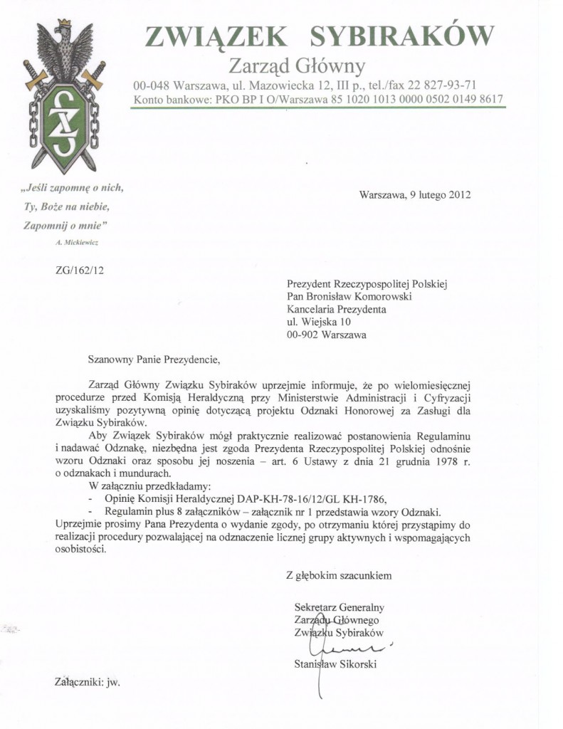 Zarząd Główny informuje, że zakończyła się procedura zatwierdzania regulaminu, wzorów odznaczenia, wzorów legitymacji itp. dotycząca wprowadzenia nowego odznaczenia „za Zasługi dla Związku Sybiraków”. Tę procedurę formalnie kończy pismo Zarządu Głównego do Prezydenta Rzeczypospolitej Polskiej i odpowiedź Szefa Kancelarii Prezydenta Rzeczypospolitej Polskiej. Podajemy poniżej: Oprac.: ZG ZS Przeczytano 29 Nawigacja wpisu 112. urodziny pani Apolonii Lisowskiej Z młodzieżą o zesłaniu na Sybir