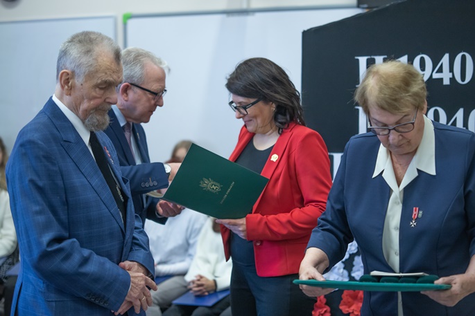 W dniu 12.04.2022 r. Sybiracy spotkali się ze społecznością szkolną w Zespole Szkół Technicznych i Ogólnokształcących z Oddziałami Integracyjnymi im. S. Staszica w Białymstoku w celu uczczenia kwietniowej rocznicy deportacji Polaków na Sybir. Grupa Sybiraków, zaproszeni goście oraz młodzież szkolna spotkali się w dużej sali gimnastycznej, w której na frontowej ścianie były plansza w kolorze granatowym i umieszczone na niej daty kolejnych deportacji. Po serdecznym powitaniu obecnych przez dyrektora Szkoły Mariusza Pęzę, chór szkolny odśpiewał Hymn Sybiraków, a następnie głos zabrał prezes Oddziału Związku Sybiraków w Białymstoku pan Tadeusz Chwiedź. W swoim przemówieniu umiejętnie połączył fakty historyczne ze swoimi osobistymi przeżyciami i przekazał młodzieży „żywą lekcję historii, którą przeżył każdy Sybirak”. Opowiedział przeżycia małego dziecka, jakim był podówczas na zesłaniu, skłaniają do głębokich refleksji, gdy widzi tragiczne realia wojny na Ukrainie, a szczególnie dramat dzieci. Następnie zabrał głos zastępca prezesa pan Jerzy Bołtuć. Jako były nauczyciel, zwrócił się przede wszystkim do pedagogów, by na lekcjach historii przekazywać młodzieży niezafałszowaną prawdę historyczną. Ceremoniał odznaczeń odbył się w ciszy i skupieniu. Odznaczenia związkowe dotyczyły przede wszystkim dyrektorów szkół i nauczycieli. Złotą Odznaką Zasłużony dla Związku Sybiraków została odznaczona Pani Dyrektor III LO w Białymstoku Anna Kietlińska, natomiast Odznaką Honorową Sybiraka uhonorowano 8 osób; były to Mariusz Pęza, Katarzyna Rakowska, Beata Konopko, Barbara Zin-Dziedzic, Anna Satuła, Danuta Łazar, Marek Józefowicz, Bogdan Wróbel. Są to osoby ściśle współpracujące ze Związkiem Sybiraków. Program artystyczny w wykonaniu uczniów w/w szkoły, oparty na faktach historycznych i wierszach o tragedii zesłańców i tęsknocie do ojczyzny wzbudził w słuchaczach wielkie wzruszenie, natomiast pieśń „Kwiaty polskie” niejednemu wycisnęła łzę z oka. Takie spotkania zawsze budzą w nas , Sybirakach, wielkie wzruszenie i pamięć o tamtych tragicznych latach. Opracowała: Jolanta Hryniewicka Uroczystość upamiętniająca II deportacji w ZSTiOzOI Pan T. Chwiedź dekoruje odznaką OHS dyrektora szkoły im. S Staszica pana Mariusza Pęzę. Dekoracja pani Anny Kietlińskiej Dyrektor III Liceum Ogólnokształcącego w Białymstoku Osoby odznaczone Przeczytano 65 Nawigacja wpisu 82. rocznica zbrodni katyńskiej – uroczystości w Przemyślu XIV Nowosądecki Marsz Pamięci Sybiraków – 12 kwietnia 2022 r.
