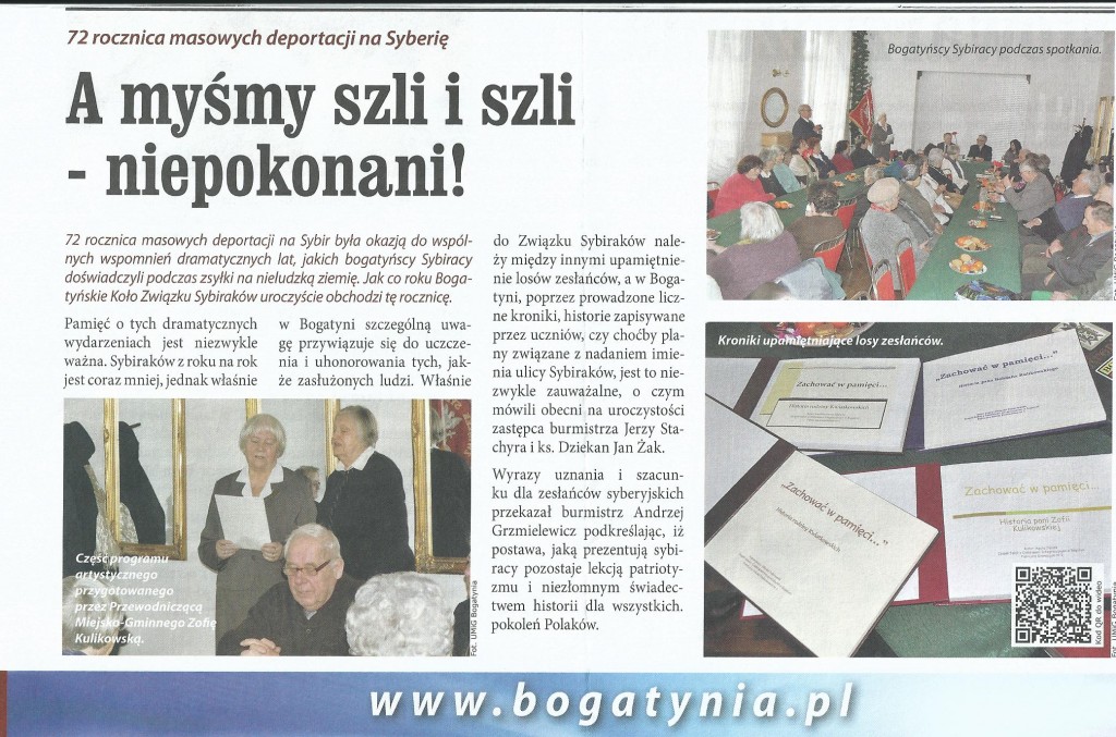 12 lutego 2012 r. odbyła się msza święta w intencji Sybiraków i Ich Rodzin w kościele Niepokalanego Poczęcia Najświętszej Marii Panny w Bogatyni. Mszę celebrował proboszcz parafii, kapelan Koła, dziekan ks. kanonik Jan Żak w asyście ks. Marcina Kubowa. Refleksyjną homilię wygłosił ks. kanonik Jan Żak. 13 lutego członkowie Koła, władze terenowe i zaproszeni goście przybyli na spotkanie z częścią artystyczną oraz wystawą prac konkursowych IV edycji „Losy Polaków na Wschodzie w latach 1939–1956”, z udziałem uczniów Zespołu Szkół z Oddziałami Integracyjnymi, Publicznego Gimnazjum nr 2 w Bogatyni. Oprac.: Zofia Kulikowska, prezes Zarządu Koła Związku Sybiraków w Bogatyni Przeczytano 24 Nawigacja wpisu 72. rocznica pierwszej masowej wywózki na Sybir w Dębnie Wspomnienia z obchodów rocznicy deportacji w Dresinie