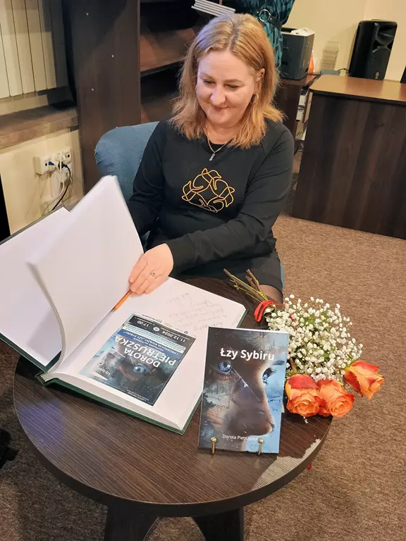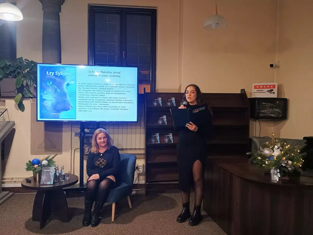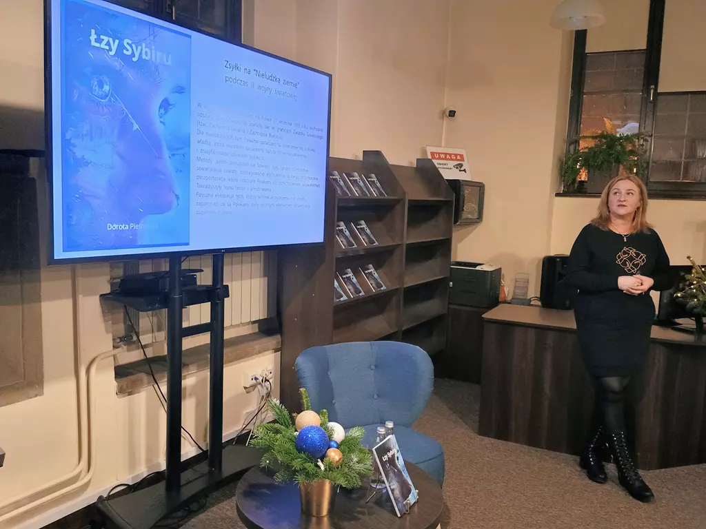 Dorota Pietruszka, nauczyciel Zespołu Szkół Nr 2 im. Sybiraków w Nowym Sączu, członek Stowarzyszenia Pamięci Zesłanych na Sybir, pasjonat historii. Odznaczona Srebrnym Medalem Opiekuna Miejsc Pamięci Narodowej, Honorową Odznaką Sybiraka, Złotą Odznaką Honorową za Zasługi dla Związku Sybiraków, medalem „Pro Memoria” za wybitne zasługi w utrwalaniu pamięci o ludziach i czynach w walce o niepodległość Polski podczas II wojny światowej i po jej zakończeniu. „Łzy Sybiru” to książka, która oddaje głos ofiarom sowieckiego reżimu i ich niezłomnemu duchowi walki o przetrwanie. To przenikliwe i wzruszające wspomnienia dzieci zesłanych na Sybir, które musiały stawić czoła największym wyzwaniom w swoim życiu. To opowieść o ich odwadze, wytrwałości, nadziei i wierze w powrót do wolnej Polski. Niech każda linijka tej książki, będzie świadectwem siły ludzkiego ducha, zdolności do przetrwania w najbardziej niesprzyjających warunkach i niezmierzonej zdolności do odnalezienia światła w ciemności. W dniu 11 grudnia 2024 r. w gościnnych progach Sądeckiej Biblioteki odbył się wieczór autorski Pani Doroty Pietruszki. Goście spotkania mieli możliwość porozmawiania z autorką jak również przyjemność posłuchać świątecznych piosenek i pastorałek w przepięknym wykonaniu naszej uczennicy Magdaleny Skarłosz. Temat książki trudny i bolesny, ale Sybiracy to Nasz Patron i któż jak nie nasza społeczność ma stać na straży pamięci o Nich. Tekst i zdjęcia: Renata Górka Przeczytano 194 Nawigacja wpisu XVII Nowosądecki Marsz Pamięci Sybiraków Wystawa pt. „Wojciech Narębski – świadek historii i strażnik pamięci o bohaterach spod Monte Cassino” w Szkole Podstawowej im. Niedźwiedzia Wojtka w Ulimiu w Gminie Deszczno.