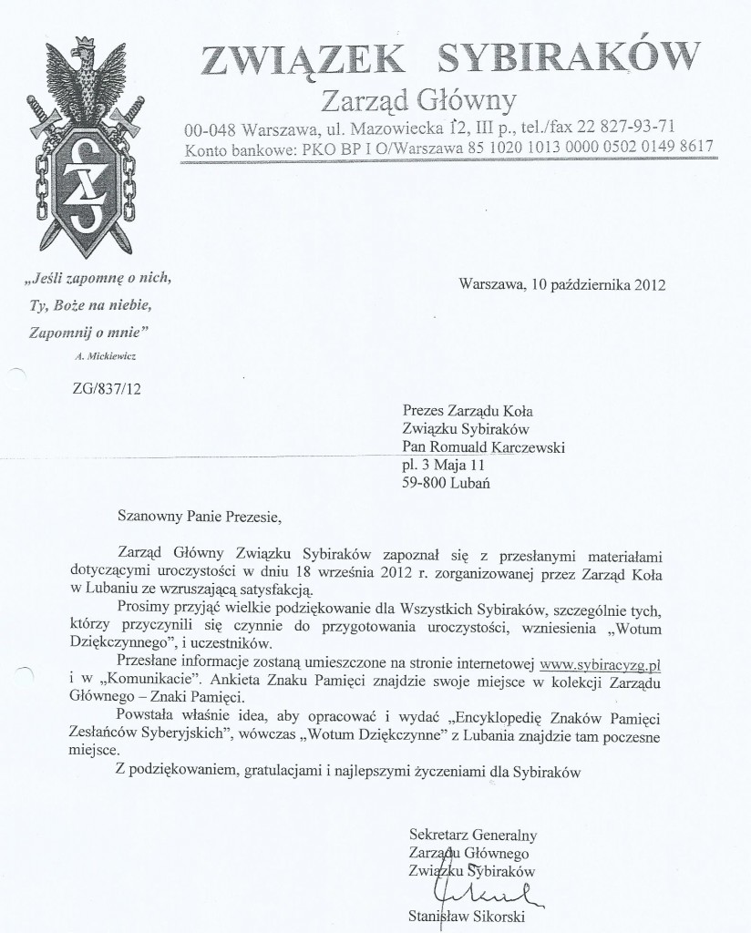 Oddziałowe uroczystości obchodów 73. rocznicy napaści Sowietów na Polskę, Dnia Sybiraka oraz odsłonięcie i poświęcenie Wotum Dziękczynnego, nowego Miejsca Pamięci Sybiraków z Lubania Oddział w Jeleniej Górze. To z serc lubańskich Sybiraków wynikła potrzeba wzniesienia Panu Bogu „Wotum Dziękczynnego”, które zostało uroczyście odsłonięte i poświęcone 18 września podczas oddziałowych religijno-patriotycznych obchodów 73. rocznicy napaści Sowietów na Polskę, Dnia Sybiraka w kościele pw. św. Jadwigi Śląskiej w Lubaniu. Na „Wotum Dziękczynne” składają się: – 2 witraże o wymiarach 97 cm x 173 cm, – 2 tablice granitowe o wymiarach 63 cm x 140 cm, – krzyż granitowy o wysokości 300 cm, rozpiętości ramion 130 cm. Całość znajduje się w nowo budowanym kościele pw. św. Jadwigi w Lubaniu. Lewy witraż przedstawia patrona Sybiraków Rafała Kalinowskiego, a prawy Matkę Boską Sybiraków, godło Związku oraz datę powstania i reaktywowania Związku. Pomiędzy witrażami znajduje się krzyż z napisem Sybir – Golgota Wschodu – Pamiętamy. Na krzyżu widnieje godło Związku. Po lewej stronie krzyża znajduje się tablica zawierająca nazwy 19 miejscowości zsyłek oraz ważniejsze daty zsyłek, począwszy od 1768 r. Po prawej stronie krzyża tablica zawiera słowa dziękczynne za powrót z zesłania – „Dla upamiętnienia rodaków pomordowanych, zmarłych z głodu i wycieńczenia na »Nieludzkiej Ziemi« wotum dziękczynne wznieśli wdzięczni Bogu za cudowne ocalenie i powrót do ojczyzny Sybiracy z Koła Lubań”. Na tablicach widnieje awers i rewers Krzyża Zesłańców Sybiru. Pod witrażami znajdują się tabliczki z imionami i nazwiskami 154 darczyńców Sybiraków z Koła Lubań. Uroczystość rozpoczęła się zaciągnięciem warty honorowej przy Wotum Dziękczynnym, wprowadzeniem kompanii honorowej, którą stanowili uczniowie klasy wojskowej z ZSP im. Kombatantów Ziemi Lubańskiej oraz klasy policyjnej z ZSP nr 2, oraz wprowadzeniem 23 pocztów sztandarowych. Tę część poprowadził Mieczysław Martusewicz. W mszy świętej celebrowanej z udziałem ks. biskupa Stefana Cichego oraz 8 księży z dziekanem Andrzejem Filą, proboszczem parafii, uczestniczyli również posłowie na Sejm RP Marzena Machałek i Zofia Czernow, wiceprezes Zarządu Głównego ZS Bożena Dudzińska, włodarze powiatu starosta Walery Czarnecki i wicestarosta Konrad Rowiński, burmistrz Lubania Arkadiusz Słowiński, gospodarze ościennych gmin, radni, poczty sztandarowe: kombatanckie, zakładów pracy, harcerstwa i szkół z terenu Lubania. Na uroczystość przybyli delegaci z 9 kół terenowych wraz z pocztami sztandarowymi z Bogatyni, Gryfowa, Jeleniej Góry, Lubania, Karpacza, Świeradowa i Zgorzelca. Uczestniczyły sztandary szkół z Gimnazjum Samorządowego nr 2 w Bolesławcu im. Polaków Zesłanych na Sybir, Prywatnego Gimnazjum w Lwówku Śląskim im. Sybiraków, Szkoły Podstawowej w Szarocinie im. Zesłańców Sybiru oraz ze szkoły w Świeradowie. Licznie przybyła młodzież, parafianie, a przede wszystkim Sybiracy. Wzruszającą homilię poświęconą Sybirakom, a zwłaszcza ich patronom, których wizerunki widnieją na witrażach, wygłosił ks. biskup Stefan Cichy. W czasie mszy Pismo Święte i modlitwy wiernych czytali Sybiracy. W darach ołtarza m.in. wręczono ornat i 2 komplety Księgi Sybiraków. O poświęcenie Wotum Dziękczynnego poprosił Jego Ekscelencję prezes Zarządu Koła ZS w Lubaniu Romuald Karczewski, zaś Regina Karczewska wręczyła dostojnemu gościowi kwiaty. Aktu uroczystego odsłonięcia Wotum Dziękczynnego dokonali: prezes Bożena Dudzińska, starosta Walery Czarnecki i Romuald Karczewski. Część patriotyczna rozpoczęła się odegraniem przez orkiestrę hymnu państwowego. Przemówienia okolicznościowe wygłosili – starosta Walery Czarnecki, wiceprezes Zarządu Głównego Bożena Dudzińska, posłanki Marzena Machałek i Zofia Czernow. Apel poległych przeprowadził Mieczysław Klatt z udziałem kompanii honorowej i orkiestry z MDK uświetniającej uroczystość. Następnie delegacje złożyły wiązanki kwiatów. Na zakończenie uroczystości wychowankowie lubańskiego domu kultury zaprezentowali program słowno-muzyczny. Uroczystość zakończono odegraniem Hymnu Sybiraków. Koło Lubań Związku Sybiraków obejmuje miasta Lubań i Olszynę oraz gminy Siekierczyn i Lubań. Zrzeszonych jest w nim 220 Sybiraków, w tym 44 podopiecznych, 5 członków rodzin sybirackich i 14 honorowych Sybiraków. Wotum Dziękczynne powstało wg projektu i staraniem Zarządu Koła. Akcja zbierania datków na jego realizację trwała 3 lata Oprac.: Romuald Karczewski, Prezes Zarządu Koła ZS Przeczytano 38 Nawigacja wpisu 17 września w Oddziale Związku Sybiraków w Jarosławiu Tablica poświęcona pamięci Edwarda Duchnowskiego