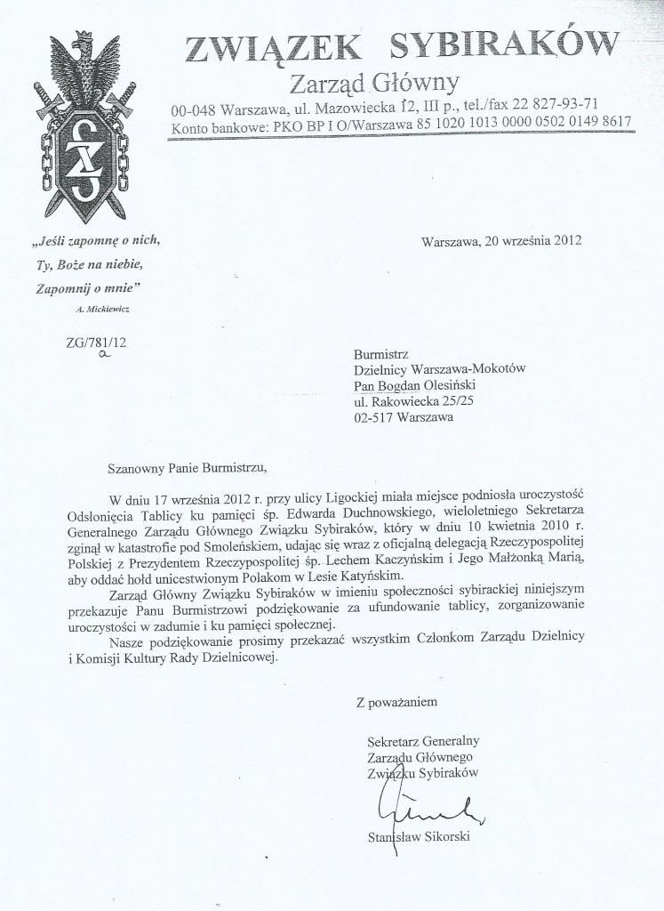 Staraniem Oddziału Warszawskiego Związku Sybiraków w dniu 17 września 2012 r. o godz. 11 została odsłonięta tablica poświęcona pamięci Edwarda Duchnowskiego, Sekretarza Generalnego Związku Sybiraków. Edward Duchnowski urodził się w 1930 r. w Podbielu, pow. łomżyński. W czerwcu 1941 r. został wywieziony wraz z rodziną do dalekiego Kraju Ałtajskiego, w którym by przeżyć, ciężko pracował przy wyrębie lasu. Permanentny głód, ciężka, ponad siły praca, choroby (bez dostępu do kwalifikowanej służby medycznej i lekarstw), brak odzieży odpowiedniej do surowych warunków klimatycznych, brak możliwości kształcenia się i dostępu do dóbr kultury wyniszczały młody organizm fizycznie i degradowały psychicznie. Dzięki wrodzonej odporności, czułej opiece matki i odrobinie szczęścia przetrwał Edward ową ponad pięcioletnią gehennę – „Polską Golgotę Wschodu”. Po powrocie do kraju nabiera sił i odzyskuje stopniowo równowagę psychiczną. Kosztem wyrzeczeń własnych i rodziny nadrabia zaległości edukacyjne, kończy studia chemiczne na Uniwersytecie Warszawskim. Odbywa staż w Zakładach Fotochemicznych, następnie krótko pracuje w Polskiej Akademii Nauk, by ostatecznie podjąć pracę w Zakładach Winiarsko-Spożywczych „Warsowin”. Zostaje cenionym pracownikiem, o czym świadczą liczne nagrody, odznaczenia i powierzanie wyższych stanowisk kierowniczych. W konsekwencji zostaje dyrektorem naczelnym „Warsowinu”. Gdy w 1988 r. wszczęto procedurę reaktywowania Związku Sybiraków, wspierał działania Komitetu Inicjatywnego. Po przejściu w 1990 r. na emeryturę, całkowicie poświęcił się działalności społecznej w Związku Sybiraków. Od 1993 r. aż do tragicznej śmierci w katastrofie lotniczej pod Smoleńskiem nieprzerwanie pełnił funkcję Sekretarza Generalnego Związku Sybiraków. Tablica została w całości (materiał, wykonawstwo, zabezpieczenie materiałowe uroczystości) sfinansowana przez Urząd m.st. Warszawy Dzielnica Mokotów. Na uroczystość przybyli liczni członkowie Rodziny śp. Edwarda Duchnowskiego, Kierownik UdsKiOR Jan Stanisław Ciechanowski, Burmistrz Dzielnicy Mokotów Bogdan Olesiński, jego zastępca Krzysztof Skolimowski (kierował zespołem przygotowującym tablicę), zastępca Dowódcy Garnizonu płk Adam Wronecki, Prezes Zarządu Głównego Związku Sybiraków Tadeusz Chwiedź, Sekretarz Generalny Związku Sybiraków Stanisław Sikorski, Przedstawiciele Prezydent m.st. Warszawy, Sybiracy z Zarządu Oddziału Warszawskich Kół, mieszkańcy dzielnicy Mokotów. Uroczystość uświetniały sztandary Zarządu Głównego, Oddziału Warszawskiego i Kół Sybiraków w liczbie 5 sztandarów i 2 proporców. Uroczystość odbyła się według ceremoniału Wojska Polskiego. Poświęcenia tablicy dokonał ks. płk Domin, proboszcz Parafii Wojskowo-Cywilnej pw. Matki Boskiej Ostrobramskiej. Przemówienie wygłosił Kierownik UdsKiOR Jan Stanisław Ciechanowski. Podziękowali fundatorom tablicy, organizatorom uroczystości i uczestnikom imprezy Prezes Zarządu Głównego Związku Sybiraków i córka śp. Edwarda Duchnowskiego. Treść tablicy: W tym domu w latach 1980–2010 mieszkał Edward Duchnowski 1930–2010 Sekretarz Generalny Związku Sybiraków w latach 1993–2010 Z poświęceniem i pełnym zaangażowaniem realizował zadania statutowe utrwalając pamięć o polskiej Golgocie Wschodu Zginął śmiercią tragiczną w katastrofie lotniczej pod Smoleńskiem 10 kwietnia 2010 roku Cześć Jego pamięci 10 kwietnia 2012 roku Oprac.: Henryk Majewski, fot. Urząd ds. Kombatantów i Osób Represjonowanych Przeczytano 70 Nawigacja wpisu Odsłonięcie Wotum Dziękczynnego w Lubaniu 17 września 2012 na Jasnej Górze
