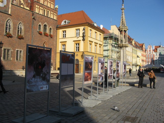 31 października br. na Rynku przy Pręgierzu we Wrocławiu została otwarta plenerowa wystawa pn. „Golgota Wschodu”, zorganizowana przez Ośrodek „Pamięć i Przyszłość”, Oddział Związku Sybiraków we Wrocławiu oraz Stowarzyszenie Pamięci Zesłańców Sybiru. Wystawa trwała do 15 listopada, a następnie ruszyła do miast, które chcą ja gościć: na początek Kłodzko. Oprac.: Włodzimierz Kowalczyk Przeczytano 27 Nawigacja wpisu Tradycja pod pomnikiem Sybiraka Otwarcie cmentarza nad Jeziorem Wiktorii