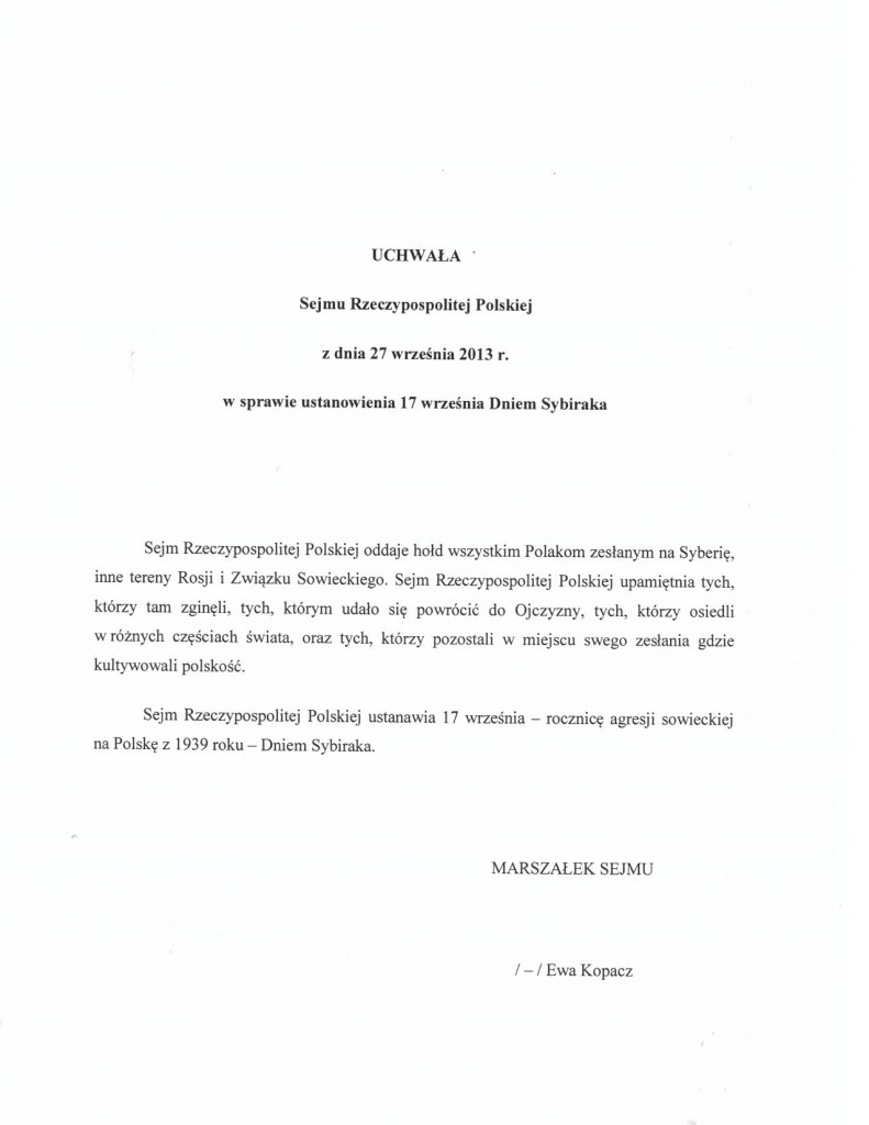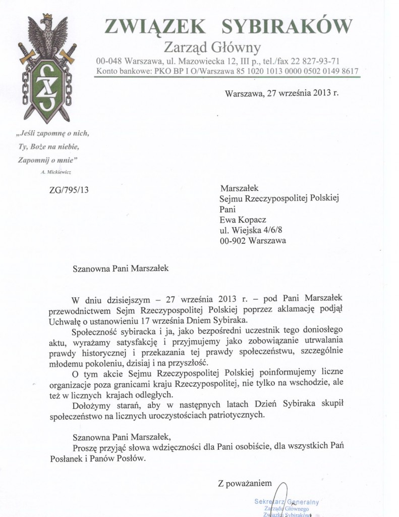 Dzisiaj (27 września 2013 r.) Sejm Rzeczypospolitej Polskiej o godz. 9.00 poprzez aklamację przyjął Uchwałę ustanawiającą dzień 17 września Dniem Sybiraka. Posłanki i posłowie, powstając, oklaskami dokonali tego aktu. Dla społeczności sybirackiej to wielka satysfakcja i dodatkowe zobowiązanie, aby utrwalać w pamięci Polek i Polaków historię i przekazywać następnym pokoleniom. Oprac.: ZG ZS Przeczytano 27 Nawigacja wpisu Dzień Patrona w Zespole Szkół Centrum Kształcenia Rolniczego im. Zesłańców Sybiru w Bobowicku 27 września – święto Gimnazjum nr 1 w Trzebnicy