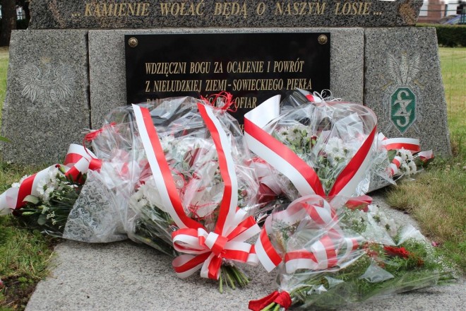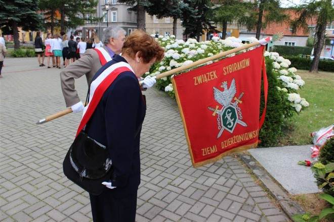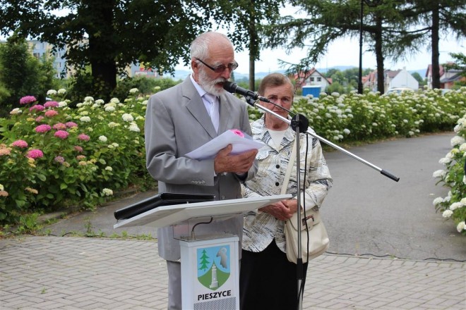 „Składamy dziś hołd cierpieniu, którego doświadczyli zesłańcy skazani przez stalinowskie represje na zagładę. Czcimy dziś pamięć tych, co pozostali na zawsze na »nieludzkiej ziemi«, i tych, którzy już po powrocie odeszli z tego świata” – mówił w swoim przemówieniu podczas obchodów 74. rocznicy trzeciej masowej deportacji na Sybir w Pieszycach Eugeniusz Kuszka, prezes Zarządu Koła Związku Sybiraków Ziemi Dzierżoniowskiej i Zarządu Oddziału ZS we Wrocławiu. Obchody 24 czerwca 2014 r. rozpoczęła msza święta w kościele pw. św. Antoniego, podczas której homilię wygłosił ks. Krzysztof Iskra. Bardzo miłym akcentem był przygotowany przez Zdzisława Maciejewskiego, sekretarza Związku Kombatantów RP i Byłych Więźniów Politycznych w Pieszycach, wiersz skierowany do Sybiraczki – pani Zofii Kondrat, co wywołało jej wzruszenie i radość. Poeta podziękował i docenił postawę pani Zofii, która zesłana na „nieludzką ziemię” broniła godności polskich kobiet. Burmistrz Pieszyc Mirosław Obal w swoim przemówieniu przedstawił zarys historyczny deportacji Polaków i odwołał się do wolności, z której wciąż musimy nauczyć się korzystać i którą dziś, po wielu trudnych dla Polski i Polaków czasach, powinniśmy docenić i szanować. W trakcie uroczystości przybyłe delegacje przy płycie pomnika upamiętniającego golgotę pieszyckich Sybiraków złożyły wiązanki kwiatów: delegacja Koła Związku Sybiraków Ziemi Dzierżoniowskiej, delegacja Związku Kombatantów RP i Byłych Więźniów Politycznych w Pieszycach, burmistrz miasta Pieszyce Mirosław Obal, przewodnicząca Rady Miejskiej w Pieszycach Urszula Kordiak, przedstawiciele Związku Emerytów, Rencistów i Inwalidów – Zarząd Rejonowy w Pieszycach, Polskiego Związku Niewidomych w Dzierżoniowie oraz grupa młodzieży ze Szkoły Podstawowej nr 1 w Pieszycach. Zdzisław Maciejewski ze Związku Kombatantów RP i Byłych Więźniów Politycznych w Pieszycach zadedykował wiersz Sybiraczce pani Zofii Kondrat Przybyli na uroczystość przedstawiciele władz i organizacji kombatanckich (od lewej): burmistrz Pieszyc Mirosław Obal, przewodnicząca Rady Miejskiej Urszula Kordiak, Zdzisław Maciejewski – sekretarz, Lucjan Serafin – prezes i przedstawicielka Związku Kombatantów RP i Byłych Więźniów Politycznych w Pieszycach, Eugeniusz Kuszka – prezes Zarządu Koła ZS Ziemi Dzierżoniowskiej i prezes Zarządu Oddziału ZS we Wrocławiu, przedstawicielka Polskiego Związku Niewidomych w Dzierżoniowie Poczet sztandarowy Koła ZS Ziemi Dzierżoniowskiej Pomnik golgoty pieszyckich Sybiraków Tekst i zdjęcia: portal www.pieszyce.pl Przeczytano 70 Nawigacja wpisu Odsłonięcie obelisku Sybiraków w Gromadce XVI Zjazd Ogólnopolskiego Klubu Pawłodarczyka