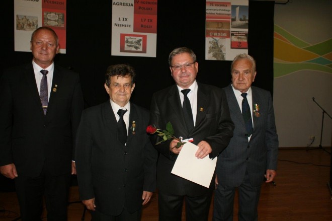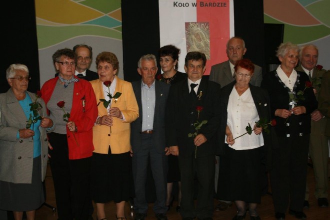 Już 17 lat działa w Bardzie Koło Związku Sybiraków. Z tej okazji 21 września odbyła się uroczystość, podczas której przypomniano również wielkie tragiczne rocznice dla Polski – 75 lat od napaści Niemiec i ZSRR, 70. rocznicę wybuchu powstania warszawskiego, 75. rocznicę powstania Państwa Podziemnego i 100. utworzenia Legionów Polskich. W uroczystej mszy świętej odprawionej przez proboszcza o. Mirosława Grakowicza udział wzięli sybiracy z gminy Bardo oraz gminy Ziębice, kombatanci, młodzież szkolna, strażacy z OSP Bardo, a także burmistrz miasta i gminy Bardo Krzysztof Żegański, przewodniczący Rady Miejskiej w Bardzie Dariusz Prostko, starosta ząbkowicki Roman Fester, przedstawiciele Nadleśnictwa Bardo Śląskie, prezes Banku Spółdzielczego w Ząbkowicach Śląskich Józefa Warechowicz oraz wszyscy, którym los ojczyzny i Polaków nie jest obojętny. W kilkunastu przejmujących zdaniach prezes Zarządu Koła Związku Sybiraków Kazimierz Bobula przypomniał poniewierkę, heroiczną walkę i trudy zsyłki milionów Polaków na Syberię. Na zakończenie mszy świętej przedstawiciele władzy, Kół Związku Sybiraków i instytucji gminnych złożyli kwiaty pod tablicą upamiętniającą martyrologię narodu polskiego. Następnie w Centrum Kultury i Promocji młodzież z Gimnazjum Publicznego w Przyłęku i zespół Wiolinek słowami piosenek i wierszy wprowadziły zgromadzonych w nastrój zadumy i nostalgii. Wszystkim Sybirakom i kombatantom burmistrz miasta i gminy Krzysztof Żegański wpiął herb gminy Bardo z wizerunkiem Matki Boskiej. Wyróżnieni nie kryli radości i wzruszenia z takiego wyróżnienia. Złotą Odznakę za Zasługi dla Związku Sybiraków otrzymał, z rąk prezesa Kazimierza Bobuli i prezesa Koła ZS w Ziębicach Mariana Gwiazdowskiego, Andrzej Kardaś. Podziękowanie za przygotowanie uroczystości prezes Zarządu Koła przekazał na ręce Dariusza Szewczyka, Katarzyny Krzysińskiej i Anny Bartkiewicz-Czai. Burmistrz Krzysztof Żegański na zakończenie spotkania podkreślił, że pamięć o ludziach, którzy tworzą historię i są jej żywym dowodem, jest patriotycznym obowiązkiem każdego Polaka. Złożenie kwiatów pod tablicą pamiątkową przy kościele Nawiedzenia Najświętszej Marii Panny przez przedstawicieli Koła ZS w Bardzie. Pośrodku prezes Zarządu Koła Kazimierz Bobula Młodzież z Gimnazjum Publicznego w Przyłęku i zespół Wiolinek przedstawiły program artystyczny Sybiracy i kombatanci wyróżnieni przez burmistrza Barda Od lewej: burmistrz Krzysztof Żegański, prezes Zarządu Koła ZS w Ziębicach Marian Gwiazdowski, odznaczony Odznaką Honorową za Zasługi dla Związku Sybiraków Andrzej Kardaś, prezes Zarządu Koła ZS w Bardzie Kazimierz Bobula Oprac.: www.bardo.pl Przeczytano 98 Nawigacja wpisu Obchody Dnia Sybiraka w Oddziale Związku Sybiraków w Łomży Uroczystość 25-lecia powstania Koła Związku Sybiraków w Świdnicy oraz 75. rocznica agresji Związku Radzieckiego na Polskę