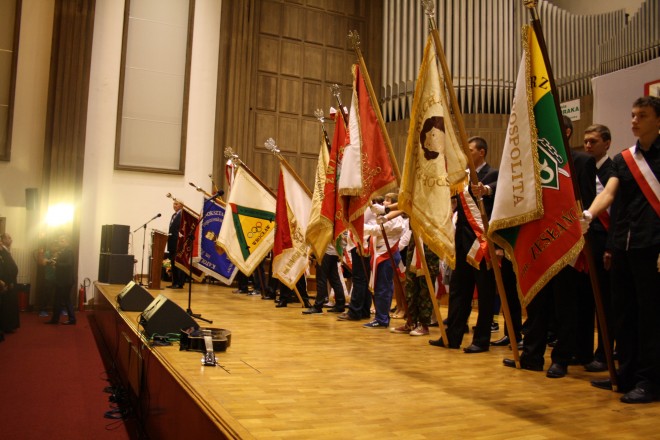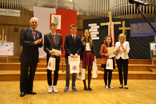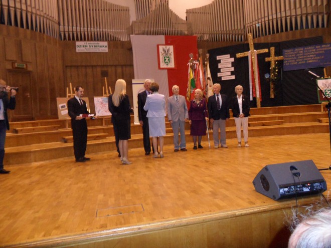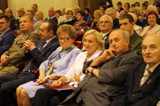 16 września 2014 r., w przeddzień Dnia Sybiraka, w Dużym Studiu Polskiego Radia odbyła się uroczysta akademia, podczas której miało miejsce wręczenie odznaczeń państwowych i związkowych zasłużonym działaczom oraz podsumowanie konkursu „Losy Polaków na Wschodzie w latach 1939–1956”. Przybyli m.in. wicemarszałek dolnośląski Radosław Małoń, wiceprezydent Wrocławia Wojciech Adamski, wicewojewoda dolnośląski Ewa Mańkowska, dolnośląski kurator oświaty Beata Pawłowicz, radny Jan Chmielewski. Po wprowadzeniu pocztów sztandarowych i przywitaniu przybyłych gości przez prezesa Zarządu Oddziału Związku Sybiraków we Wrocławiu Eugeniusza Kuszkę, głos zabrał kapelan wrocławskich Sybiraków ks. prałat dr Franciszek Głód, który po jak zwykle ciepłych i wzruszających słowach skierowanych do Sybiraków, zakończył swoje wystąpienie modlitwą. Wicewojewoda Ewa Mańkowska, po krótkim wystąpieniu, dokonała dekoracji odznaczeniami państwowymi zasłużonych Sybiraków. Medalem Pro Patria odznaczony został m.in. prezes Zarządu Oddziału ZS Eugeniusz Kuszka. Sympatycznym wydarzeniem było nadanie zasłużonemu wrocławskiemu Sybirakowi Czesławowi Strzyglewskiemu, wieloletniemu prezesowi Zarządu Koła, tytułu Honorowego Prezesa Zarządu Koła Wrocław-Stare Miasto. Dolnośląski kurator oświaty Beata Pawłowicz w swoim wystąpieniu, podsumowującym siódmą już edycję corocznego konkursu „Losy Polaków na Wschodzie w latach 1939–1956”, podkreśliła, iż uczniowie biorący udział w konkursie nie tylko uczestniczą w niecodziennej lekcji historii, ale poprzez działanie i poszukiwanie przyjmują odpowiedzialność za przekazywanie historii Sybiraków innym. Następnie laureatom konkursu dolnośląskich szkół zostały wręczone dyplomy i nagrody rzeczowe ufundowane przez Kuratorium Oświaty i wrocławski Oddział Związku Sybiraków. Na zakończenie uroczystości wystąpiła młodzież z Gimnazjum im. Macieja Rataja w Żmigrodzie. 17 września 2014 r., w 75. rocznicę napaści Związku Radzieckiego na Polskę, Dzień Sybiraka we Wrocławiu rozpoczął się uroczystą, celebrowaną mszą świętą w kościele św. Bonifacego. Mszę odprawił proboszcz parafii ks. prałat Wojciech Tokarz w asyście kapelana wrocławskich Sybiraków ks. prałata dr. Franciszka Głoda, który wygłosił wzruszającą homilię. Po mszy wszyscy uczestnicy udali się na skwer Sybiraka pod pomnik Zesłańcom Sybiru, gdzie nastąpił uroczysty apel poległych, oddana została salwa honorowa, złożone zostały wieńce i wiązanki kwiatów przez przedstawicieli władz wojewódzkich, samorządowych, organizacje kombatanckie oraz licznie zgromadzoną młodzież szkolną i harcerską. Poczty sztandarowe przybyłe na uroczystości w Dużym Studiu Polskiego Radia Siedzą od lewej: wicemarszałek dolnośląski Radosław Małoń, płk Sowa, wiceprezydent Wrocławia Wojciech Adamski, wicewojewoda dolnośląski Ewa Mańkowska, dolnośląski kurator oświaty Beata Pawłowicz, radny Jan Chmielewski, Czesław Szczyglewski (były prezes Zarządu Koła Wrocław-Stare Miasto) Wręczenie przez wicewojewodę Ewę Mańkowską medali Pro Patria Dolnośląski kurator oświaty Beata Pawłowicz Laureaci konkursu „Losy Polaków na Wschodzie w latach 1939–1956” wraz z kurator Beatą Pawłowicz i prezesem Zarządu Oddziału ZS we Wrocławiu Eugeniuszem Kuszką Występ młodzieży Gimnazjum im. Macieja Rataja w Żmigrodzie Oprac.: Włodzimierz Kowalczyk Przeczytano 48 Nawigacja wpisu Dzień Sybiraka w Gdańsku Pomnik Matki Sybiraczki w Szczecinie