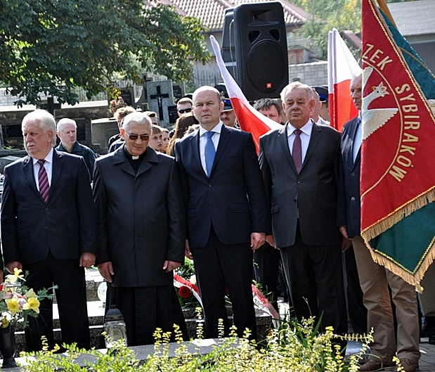 17 września 2014 r. w Mławie odbyły się uroczystości poświęcone 75. rocznicy napaści rosyjskiej na Polskę w 1939 r. Podczas obchodów zabrakło (z powodu choroby) Stefana Dzikowskiego, prezesa Zarządu Oddziału Związku Sybiraków z siedzibą w Mławie. W zastępstwie dziadka – prezesa uroczystości na cmentarzu poprowadził wnuk – Piotr Dzikowski. Wspomniał, że dziadek zachorował po tym, jak zniszczono (oblano czerwoną farbą) pomnik Zesłańców Sybiru, wzniesiony w głównej mierze ze składek członkowskich. „Dziadek na wieść o tym dostał zawału serca. Niemal przypłacił to życiem. Dzięki panu burmistrzowi i innym osobom pomnik odnowiono. Dziadek chciał podziękować. Prosił, żebym o tym powiedział” – usłyszeliśmy od Piotra Dzikowskiego. Obchody rozpoczęła msza święta w kościele Świętej Trójcy. Następnie Mławska Orkiestra Dęta poprowadziła ulicami Mławy poczty sztandarowe, delegacje i mieszkańców na cmentarz parafialny. Tam nie zabrakło okolicznościowych przemówień. Burmistrz miasta Sławomir Kowalewski podkreślał, że wolność nie jest nam dana na zawsze, trzeba o nią zabiegać. Przypomniał, że w 1939 r. zostaliśmy zaatakowani po około 20 latach wolności. Proboszcz z kościoła Świętej Trójcy ks. Ryszard Kamiński przypomniał o cierpieniu i prześladowaniach Polaków za przynależność narodową. Delegacje złożyły kwiaty przed pomnikiem Zesłańców Sybiru. Podczas obchodów nie zabrakło też apelu poległych i hymnu państwowego oraz Hymnu Sybiraków. O oprawę artystyczną uroczystości na cmentarzu zadbali uczniowie Zespołu Szkół Zawodowych nr 4 im. Obrońców Mławy z Września 1939 r. pod kierunkiem Pawła Stawińskiego. Następnie zebrani udali się do kina Kosmos na uroczystą akademię, na którą złożyły się prezentacja multimedialna oraz występy zespołu estradowego Szkoły Podstawowej nr 6 i I Liceum Ogólnokształcącego w Mławie. (…) Uroczysty przemarsz ulicami Mławy pod pomnik Zesłańców Sybiru na cmentarzu parafialnym Od lewej: starosta mławski Włodzimierz Wojnarowski, proboszcz kościoła Świętej Trójcy ks. Ryszard Kamiński, burmistrz Mławy Sławomir Kowalewski, przewodniczący Rady Miasta Krzysztof Wasiłowski, skarbnik Mławy Henryk Antczak Pomnik Zesłańców Sybiru Oprac.: Iwona Łazowa, „Nowy Kurier Mławski” Przeczytano 77 Nawigacja wpisu Obchody Dnia Sybiraka w Rudnej i innych Kołach Oddziału Związku Sybiraków w Legnicy Sybiracy pamiętają!