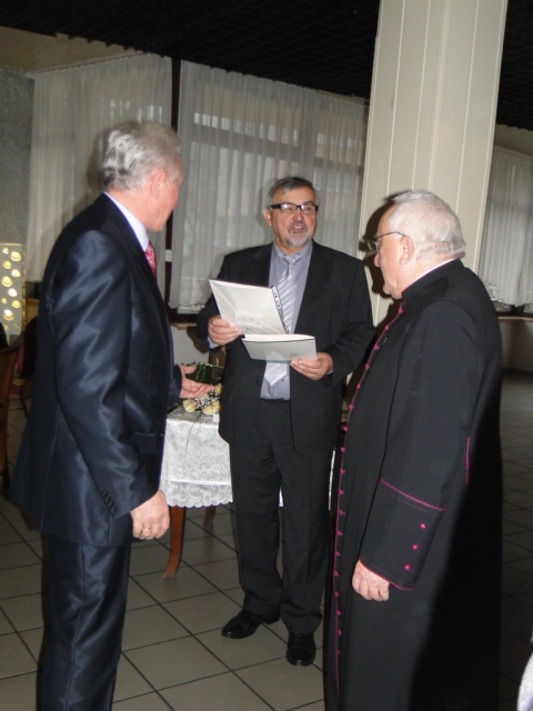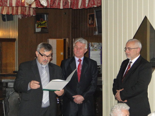 W dniu 18 stycznia 2015 r. w restauracji Tropic odbyło się spotkanie opłatkowo-noworoczne Koła Związku Sybiraków w Oławie, należącego do Oddziału we Wrocławiu. Oprócz członków Koła obecni byli zaproszeni goście, m.in. były burmistrz miasta Jelcz-Laskowice Kazimierz Putyra, Eugeniusz Kuszka – prezes Zarządu Oddziału ZS we Wrocławiu i wiceprezes Zarządu Głównego, dyrektor Zespołu Szkół Ponadgimnazjalnych nr 2 w Oławie Jadwiga Braniewska, diakon archidiecezji wrocławskiej Arkadiusz Krzeszowiec oraz wiceprzewodniczący Ogólnopolskiego Klubu Kombatantów 1. Drezdeńskiego Korpusu Pancernego płk rezerwy Eugeniusz Praczuk. Wśród licznie zgromadzonych Sybiraków nie zabrakło pani Łucji Michalik, powszechnie znanej i szanowanej Sybiraczki, autorki wspomnieniowej książki o zesłaniu. Wszystkich obecnych na spotkaniu przywitał prezes Zarządu Koła ZS w Oławie Aleksander Maciejewicz. Wspomniał, jak obchodzono święta na zesłaniu, gdy mimo ciężkich warunków starano się godnie przeżyć ten czas. Prezes Eugeniusz Kuszka, dziękując za zaproszenie, życzył zgromadzonym wszystkiego dobrego w rozpoczętym roku, dużo zdrowia i dalszej aktywnej działalności na rzecz społeczności sybirackiej. Przy składaniu życzeń nie zabrakło łez wzruszenia i wspomnień. Uroczystość uświetnili uczniowie z Państwowej Szkoły Muzycznej I stopnia w Oławie, których przygotował do występu Jan Prochowiak, reprezentujący szkołę w imieniu nieobecnego dyrektora Jacka Gąsiora. Pod koniec uroczystości nastąpiło wręczenie odznaczeń i dyplomów podziękowań. W imieniu prezesa Zarządu Głównego ZS odznaczenie wręczył i pogratulował wyróżnionym wiceprezes Eugeniusz Kuszka. Złotą Odznakę za Zasługi dla Związku Sybiraków otrzymał ks. dziekan Stanisław Bijak, a dyplom okolicznościowy – Kazimierz Putyra. Wiceprezes Zarządu Głównego Eugeniusz Kuszka (z lewej) w asyście prezesa Zarządu Koła Aleksandra Maciejewicza (pośrodku) wręczył Złotą Odznakę Honorową za Zasługi dla Związku Sybiraków ks. dziekanowi Stanisławowi Bijakowi Były burmistrz miasta Jelcz-Laskowice Kazimierz Putyra (z prawej) otrzymał z rąk Eugeniusza Kuszki (pośrodku) i Aleksandra Maciejewicza (z lewej) dyplom okolicznościowy Oprac.: Aleksander Maciejewicz, prezes Zarządu Koła ZS w Oławie Przeczytano 31 Nawigacja wpisu Spotkanie opłatkowe w Płocku Spotkanie opłatkowe w Przemyskim Oddziale Związku Sybiraków