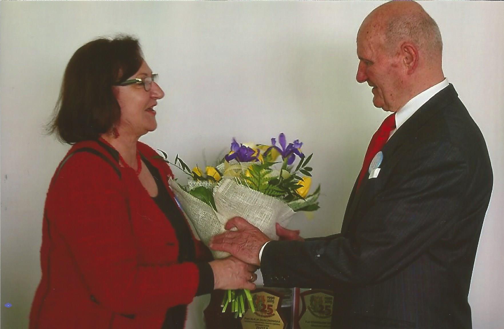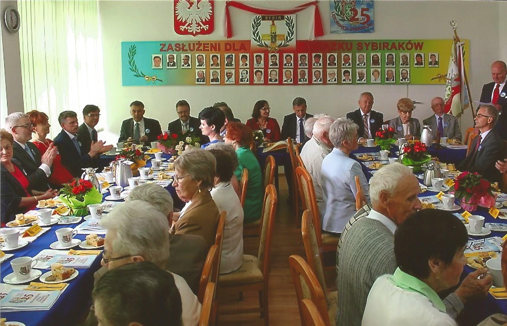 Uroczystość jubileuszu 25-lecia Koła Związku Sybiraków w Lęborku, która odbyła się 21 maja 2015 r., rozpoczął prezes Zarządu Koła Witold Bań, prosząc poczet o wprowadzenie sztandaru. Następnie odegrano Hymn Sybiraków. Bardzo serdecznie i z ogromną radością prezes powitał wszystkich zebranych. W imieniu zgromadzonych ze szczególnym szacunkiem przywitał: sekretarza generalnego Zarządu Głównego Związku Sybiraków Kordiana Borejkę, burmistrza miasta Lęborka Witolda Namyślaka, zastępcę burmistrza Alicję Zajączkowską, starostę lęborskiego Edmunda Głombiewskiego, naczelniczkę Wydziału Współpracy i Rozwoju w Urzędzie Miejskim Elżbietę Rekowską-Klassę, dyrektor Miejskiego Zarządu Gospodarki Komunalnej Ewę Brzezińską, wiceprezes Zarządu Oddziału Związku Sybiraków w Słupsku Barbarę Dolatę, dyrektor Zespołu Szkół im. Męczenników Marszu Śmierci KL Stutthof w Garczegorzu Alicję Guźniczak, a także radnych miasta Lębork i Rady Powiatu Lęborskiego. Z wielkim uznaniem i wdzięcznością przyjęto sponsorów: dyrektora Centrum Handlowego „Jantar” Franciszka Kowalewskiego, dyrektor delegatury Kuratorium Oświaty w Słupsku Teresę Lis, właściciela piekarni i ciastkarni Eugeniusza Głodowskiego, dyrektor Powiatowego Urzędu Pracy w Lęborku Wandę Konieczną, dyrektora Energa Lębork Jerzego Wierzchnickiego, właścicielkę Przedsiębiorstwa Handlowo-Usługowo-Produkcyjnego „Gąpłyt” Barbarę Okrój, właściciela P.H.U.P. „Okrój” Stanisława Okroja. Obecni byli także przedstawiciele mediów – Kanału 6, „Głosu Pomorza” i „Dziennika Bałtyckiego”. Prezes Witold Bań przedstawił zebranym rys historyczny z okresu 25-lecia działalności Koła. Następnie odbyły się wystąpienia gości: sekretarza generalnego ZG ZS Kordiana Borejki, burmistrza Witolda Namyślaka i starosty Edmunda Głombiewskiego. Zasłużonym osobom wręczone zostały odznaczenia przyznane przez Zarząd Główny Związku Sybiraków. Złotą Odznakę Honorową za Zasługi dla Związku Sybiraków otrzymali: burmistrz Witold Namyślak, zastępca burmistrza Alicja Zajączkowska, prezes Zarządu Koła ZS w Lęborku Witold Bań. Srebrną Odznakę odebrali członkowie Zarządu Koła Edmund Robak i Marian Siejka. Odznakę Honorową Sybiraka przyznano naczelniczce Wydziału Współpracy i Rozwoju w Urzędzie Miejskim Elżbiecie Rekowskiej-Klassie, dyrektor MZGK Ewie Brzezińskiej, właścicielce P.H.U.P. „Gąpłyt” Barbarze Okrój, właścicielowi P.H.U.P. „Okrój” Stanisławowi Okrojowi, dyrektorowi Energa Lębork Jerzemu Wierzchnickiemu i członkowi Koła ZS w Lęborku Zygmuntowi Dalekiemu. Dekoracji odznaczeniami dokonał sekretarz generalny Zarządu Głównego Kordian Borejko. Prezes Zarządu Koła Witold Bań wręczył podziękowania, pamiątkowe statuetki oraz filiżanki z emblematem 25-lecia lęborskich Sybiraków władzom miasta i powiatu, osobom odznaczonym oraz sponsorom. Sybiracy biorący udział w uroczystości otrzymali listy gratulacyjne z okazji jubileuszu 25-lecia Koła, a członkowie Koła i podopieczni cierpiący na poważne dolegliwości zdrowotne – wsparcie finansowe w wysokości 200 zł każdy. Ponadto członkowie Koła, którzy w okresie 25 lat pełnili funkcje w Zarządzie Koła, w podziękowaniu za pracę społeczną na rzecz lęborskich Sybiraków otrzymali wazony ze szkła kryształowego. Byli to: Edmund Robak, Zygmunt Daleki, Zofia Bladowska, Zofia Jakubiak, Jan Kuklis, Zdzisław Karwacki, Krystyna Olszewska, Bolesław Klus, Leokadia Szantyr, Ferdynand Nejranowski, Stanisław Szyłko i Witold Bań. Wyłożona została Księga Sybiraka, w której goście dokonali wpisów. Wyrażały one uznanie dla lęborskiego Koła za zorganizowanie wspaniałej uroczystości 25-lecia oraz życzenia dalszej wzorowej działalności. Przedstawiciele władz miasta i powiatu, sponsorzy oraz liczni goście przekazali na ręce prezesa Zarządu Koła pamiątkowe życzenia i kwiaty. Na zakończenie uroczystości, w części artystycznej wystąpił Kaszubski Zespół Regionalny „Levino” pod kierownictwem Franciszka Okunia z Luzina oraz Andrzej Radajewski (gitara i śpiew). W drodze na obiad uczestnicy uroczystości złożyli pod pomnikiem Zesłańcom Sybiru w alei Sybiraków wiązanki kwiatów i zapalili znicze. Starosta lęborski Edmund Głombiewski wręczył prezesowi Zarządu Koła w Lęborku Witoldowi Baniowi kwiaty i złożył gratulacje Dekoracji Witolda Bania Złotą Odznaką Honorową za Zasługi dla Związku Sybiraków dokonał sekretarz generalny Zarządu Głównego Kordian Borejko Burmistrz miasta Lębork Witold Namyślak odznaczony został Złotą Odznaką Honorową za Zasługi dla Związku Sybiraków Dostojni goście (od lewej): wiceprezes Zarządu Oddziału ZS w Słupsku Barbara Dolata, burmistrz miasta Lębork Witold Namyślak, sekretarz generalny Zarządu Głównego Kordian Borejko, Alicja Zajączkowska, prezes Zarządu Koła Witold Bań Zastępca burmistrza miasta Lębork Alicja Zajączkowska wręcza prezesowi Witoldowi Baniowi kwiaty z gratulacjami z okazji 25-lecia Koła lęborskich Sybiraków Uroczystość 25-lecia Koła ZS w Lęborku Wystawa w hołdzie zesłańcom w alei Sybiraków Pomnik Zesłańcom Sybiru w alei Sybiraków Oprac.: Witold Bań, prezes Zarządu Koła ZS w Lęborku Przeczytano 195 Nawigacja wpisu XXVI Pielgrzymka Sybiraków na Jasną Górę w Częstochowie Dzień Matki w Bydgoszczy