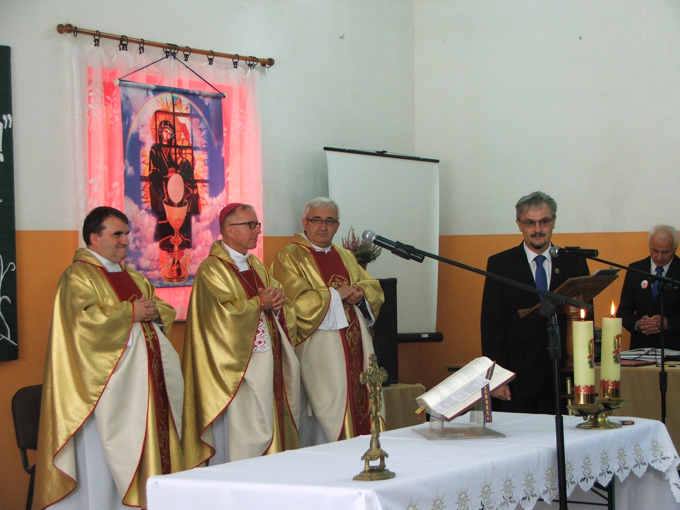 Już po raz dziesiąty społeczność Publicznej Szkoły Podstawowej w Kalinowie obchodziła swoje święto. 29 września to dzień, kiedy szkoła przed 10 laty przyjęła zaszczytne imię Zesłańców Syberyjskich. Uroczystość rozpoczęła się odśpiewaniem Hymnu Sybiraków oraz wprowadzeniem sztandarów szkół. Znalazły się wśród nich poczty sztandarowe miejscowej szkoły, sąsiednich szkół – gimnazjum i szkoły podstawowej w Jasienicy oraz Zespołu Oświatowego im. Sybiraków w Rozbitym Kamieniu (powiat sokołowski). Szkolne świętowanie zaszczycił swoją obecnością JE ks. bp Janusz Stepnowski, ordynariusz diecezji łomżyńskiej, który w asyście dziekana dekanatu Wniebowzięcia Najświętszej Maryi Panny w Ostrowi Mazowieckiej ks. prałata Jana Okuły oraz proboszcza parafii pw. św. Rocha w Jasienicy ks. kanonika Piotra Kapelańskiego odprawił mszę świętą w intencji społeczności szkolnej, Sybiraków oraz zebranych gości. W homilii ksiądz biskup podkreślił wartości, którym hołdowali zesłańcy syberyjscy – Bóg, honor i ojczyzna, oraz ich znaczenie dla wychowania młodego pokolenia Polaków w duchu patriotyzmu. Na szkolny jubileusz oprócz kapłanów przybyło też wielu szacownych gości: Marian Krupiński – radny Sejmiku Województwa Mazowieckiego, Teresa Pajka – wicedyrektor Delegatury w Ostrołęce Kuratorium Oświaty w Warszawie, Zbigniew Kamiński – starosta ostrowski, Waldemar Brzostek – wójt gminy Ostrów Mazowiecka, Sylwester Rozumek – przewodniczący Rady Gminy Ostrów Mazowiecka, radni gminy Marian Kacprzak i Bogdan Kołota, nadkom. Mirosław Olszewski – komendant powiatowy policji, mł. bryg. Leszek Falbowski – zastępca komendanta powiatowego państwowej straży pożarnej, Danuta Umińska – prezes zarządu powiatowego Towarzystwa Przyjaciół Dzieci, Jerzy Sówka – prezes Przedsiębiorstwa Usług Komunalnych i Rolniczych w Ostrowi Mazowieckiej. Przybyli też Sybiracy – „żywi patroni” szkoły, na czele z sekretarzem generalnym Zarządu Głównego Związku Sybiraków Kordianem Borejką, Sybiracy z Oddziału Warszawskiego z Marią Stankiewicz – wiceprezesem Zarządu Oddziału, Sybiracy z Oddziału ZS w Ostrołęce z Bronisławem Kurpiewskim – wiceprezesem Zarządu Oddziału, Sybiracy z Koła Ostrowskiego na czele z prezesem Tadeuszem Jemielitą. Obecni byli także państwo Celina i Jan Elceserowie – chrzestni sztandaru szkoły, właściciele miejscowej firmy Elkopol, sołtysi wsi z obwodu szkoły – Stefan Matys (Kalinowo), Elżbieta Grabowska (Podborze), Marek Wyszomirski (Prosienica), prezes OSP w Kalinowie Zbigniew Wróbel, dyrektorzy zaprzyjaźnionych szkół – Zespołu Oświatowego im. Sybiraków w Rozbitym Kamieniu Ewa Wrzosek, Gimnazjum nr 46 im. Szarych Szeregów w Warszawie Iwona Lisowska, wszyscy dyrektorzy szkół z gminy Ostrów Mazowiecka, rodzice, uczniowie oraz mieszkańcy Kalinowa i okolic. Zaraz po mszy świętej uczniowie szkoły w Kalinowie przedstawili wzruszający montaż słowno-muzyczny nawiązujący tematycznie do czasów wojny oraz zesłań. W oczach wielu słuchających, szczególnie Sybiraków, zakręciła się łza. Następnie dyrektor szkoły Adam Jabłonka przedstawił zebranym dokonania szkoły w okresie 10 lat pracy z patronem. Podkreślił, że poprzez przyjęcie imienia szkoła stała się bardziej wyrazista wychowawczo i dydaktycznie. Mogła realizować wiele ciekawych programów, np. „Moja Mała Ojczyzna” i „Katyń … ocalić od zapomnienia”. Zdobywała laury w konkursach, np. I miejsce w województwie mazowieckim w programie „Moja Mała Ojczyzna” i udział w finale krajowym, pierwsze miejsca w konkursach ogólnopolskich o patronie – Sybirakach w Białymstoku i Łodzi. Została wyróżniona odznaczeniami – medalem Pro Memoria i Odznaką Honorową Sybiraka. Bardzo ważną częścią szkolnej uroczystości było wręczenie odznaczeń sybirackich – Odznak Honorowych za Zasługi dla Związku Sybiraków, którego dokonał sekretarz generalny Kordian Borejko w asyście wiceprezes Zarządu Oddziału Warszawskiego Marii Stankiewicz i sekretarz Haliny Bieniakońskiej-Żak. Złotą Odznaką przyznaną szkole udekorowany został sztandar szkoły w Kalinowie. Złotą Odznakę otrzymali także Zbigniew Kamiński, Waldemar Brzostek i Jan Elceser, a Srebrną Odznakę Marian Kacprzak, Bogdan Kołota, Zbigniew Wróbel oraz nauczyciele: Elżbieta Grynfelder, Ewa Krupa, Bogusława Wasil, Beata Dąbkowska, Bogdan Jabłonka. W dalszej części uroczystości przybyli goście zabrali głos, dziękując za zaproszenie i gratulując społeczności szkolnej jubileuszu. Były serdeczne słowa i prezenty m.in. od Kordiana Borejki, Mariana Krupińskiego, Teresy Pajki, Zbigniewa Kamińskiego, Waldemara Brzostka, Mariana Kacprzaka, Danuty Umińskiej, Marty Kamińskiej, Jana Elcesera. Po wystąpieniach gości wszyscy zebrani przemaszerowali uroczyście na czele ze sztandarami pod pomnik Sybiraków Ziemi Ostrowskiej znajdujący się przy szkole. Tam ksiądz biskup odmówił modlitwę za zmarłych zesłańców, a delegacje złożyły kwiaty i zapaliły znicze. Uroczystość zakończyła się w szkole, gdzie zaprosiła zebranych w imieniu rodziców przewodnicząca Rady Rodziców Renata Kędzior. Tu goście mieli okazję spożyć obiad przygotowany przez rodziców, zwiedzić budynek, obejrzeć zbiory szkolne dotyczące Sybiraków oraz wpisać się do księgi pamiątkowej. Msza święta odprawiona w Publicznej Szkoły Podstawowej im. Zesłańców Syberyjskich w Kalinowie Mszy przewodniczył bp łomżyński Janusz Stepnowski Dekoracja sztandaru szkoły Złotą Odznaką Honorową za Zasługi dla Związku Sybiraków, dokonał jej sekretarz generalny Kordian Borejko Przemarsz pod pomnik Sybiraków Ziemi Ostrowskiej Modlitwa za zmarłych Sybiraków Pomnik Sybiraków Ziemi Ostrowskiej Kwiaty pod pomnikiem złożył m.in. wójt gminy Waldemar Brzostek Delegacja Związku Sybiraków Oprac.: Adam J