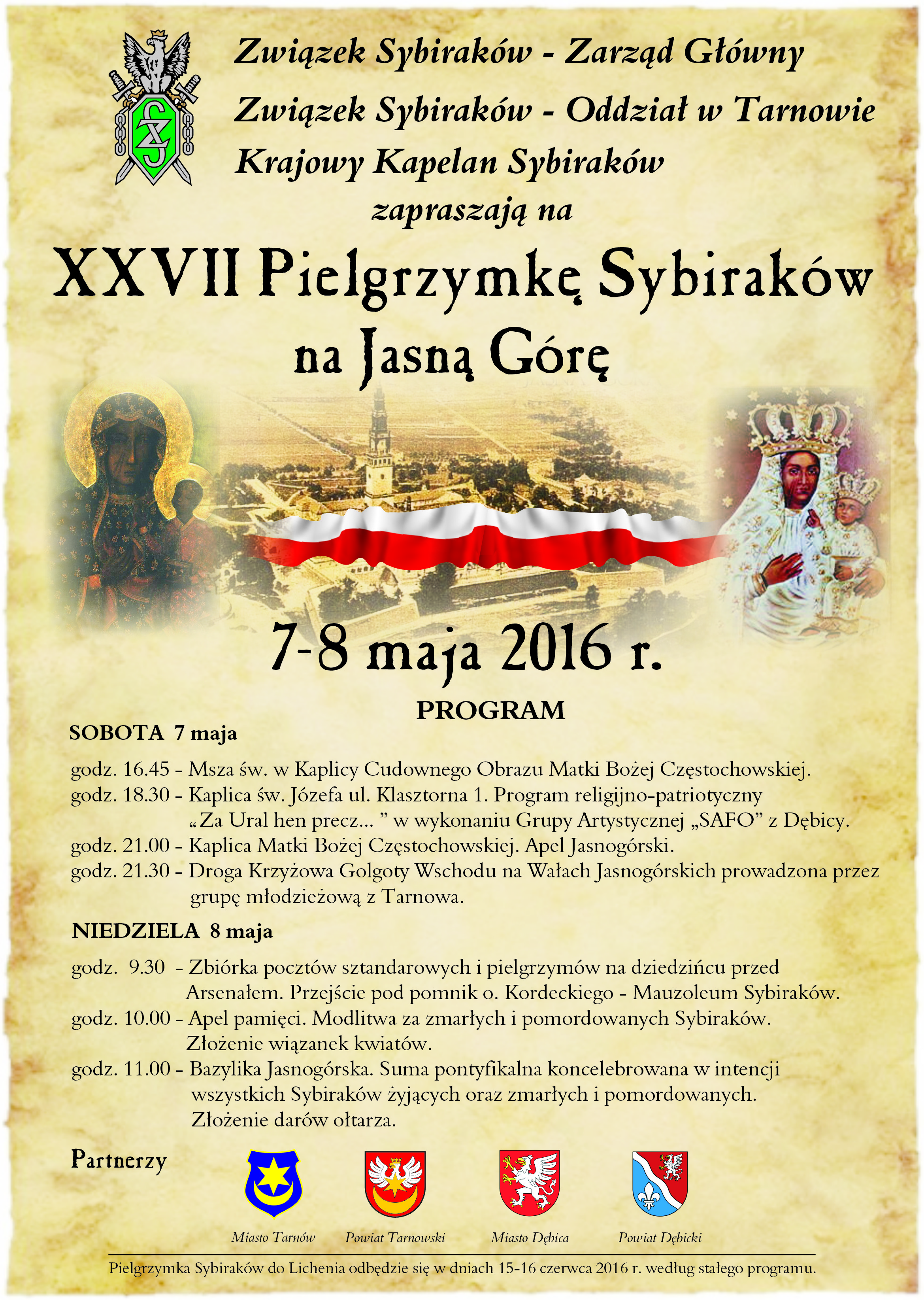 Sobota 7 maja 2016 r. – Grodziec, Sanktuarium Matki Bożej Sybiraków godz. 10 – zbiórka na Kalwarii, powitanie pocztów sztandarowych, nabożeństwo majowe – przejście do kościoła i koncert godz. 11 – msza święta w intencji Sybiraków Przeczytano 39 Nawigacja wpisu Przemyśl: „Zapal znicz wywiezionym” Odsłonięcie pomnika w Przemyślu