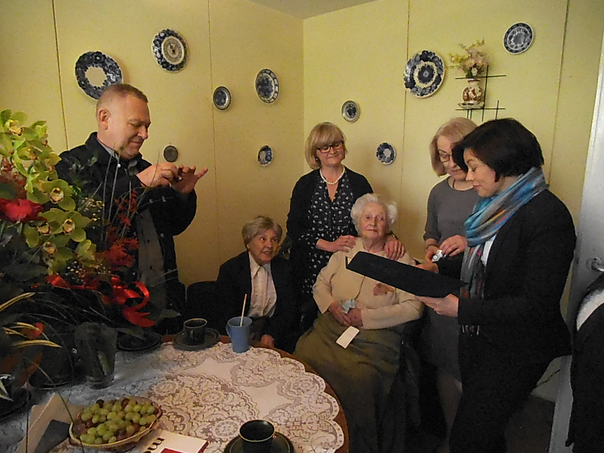W dniu 22 kwietnia 2016 r. Halina Jaśkowiak, zamieszkała w Warszawie w dzielnicy Ochota, obchodziła setną rocznicę urodzin. Z tej okazji do mieszkania jubilatki przybyli z życzeniami burmistrz dzielnicy Ochota Katarzyna Łęgiewicz oraz przedstawiciele Związku Sybiraków – prezes Zarządu Koła Zofia Pogodzińska i prezes Zarządu Oddziału Warszawskiego Mieczysław Pogodziński. Pani burmistrz przekazała jubilatce przesłanie od władz dzielnicy oraz tort i okolicznościowy upominek. Zarząd Główny Związku Sybiraków uhonorował jubilatkę Złotą Odznaką za Zasługi dla Związku Sybiraków, a od Zarządu Oddziału i Koła otrzymała kwiaty oraz dyplomy uznania i podziękowania. Przy zapalonych świecach, wśród członków rodziny i przyjaciół, w podniosłej atmosferze złożono jubilatce serdeczne życzenia dalszych długich lat życia w dobrym zdrowiu. Halina Jaśkowiak doświadczyła losu syberyjskiego zesłańca przez osiem lat. Aresztowana przez NKWD w 1944 r. za udział w szeregach Armii Krajowej, przeżywała katorgę w kilku miejscowościach na terenach północnych Związku Radzieckiego, a w końcowym okresie w północnym Kazachstanie. Po powrocie do kraju pracowała w służbie zdrowia w Warszawie. W Kole Związku Sybiraków Warszawa-Ochota cieszy się dużym uznaniem, angażowała się aktywnie w jego działalność, biorąc udział w utrwalaniu pamięci o losach zesłańców syberyjskich. Burmistrz Dzielnicy Warszawa-Ochota Katarzyna Łęgiewicz przekazuje życzenia jubilatce Prezes Zarządu Koła Związku Sybiraków Zofia Pogodzińska przekazuje życzenia Halinie Jaśkowiak Oprac.: Zofia Pogodzińska, prezes Zarządu Koła ZS Warszawa-Ochota Przeczytano 54 Nawigacja wpisu Spektakl z cyklu „Uczniowie obchodzą ważne rocznice historyczne” pt. „Losy Zesłańców Sybiru” Obchody Dnia Matki Sybiraczki w Warszawie