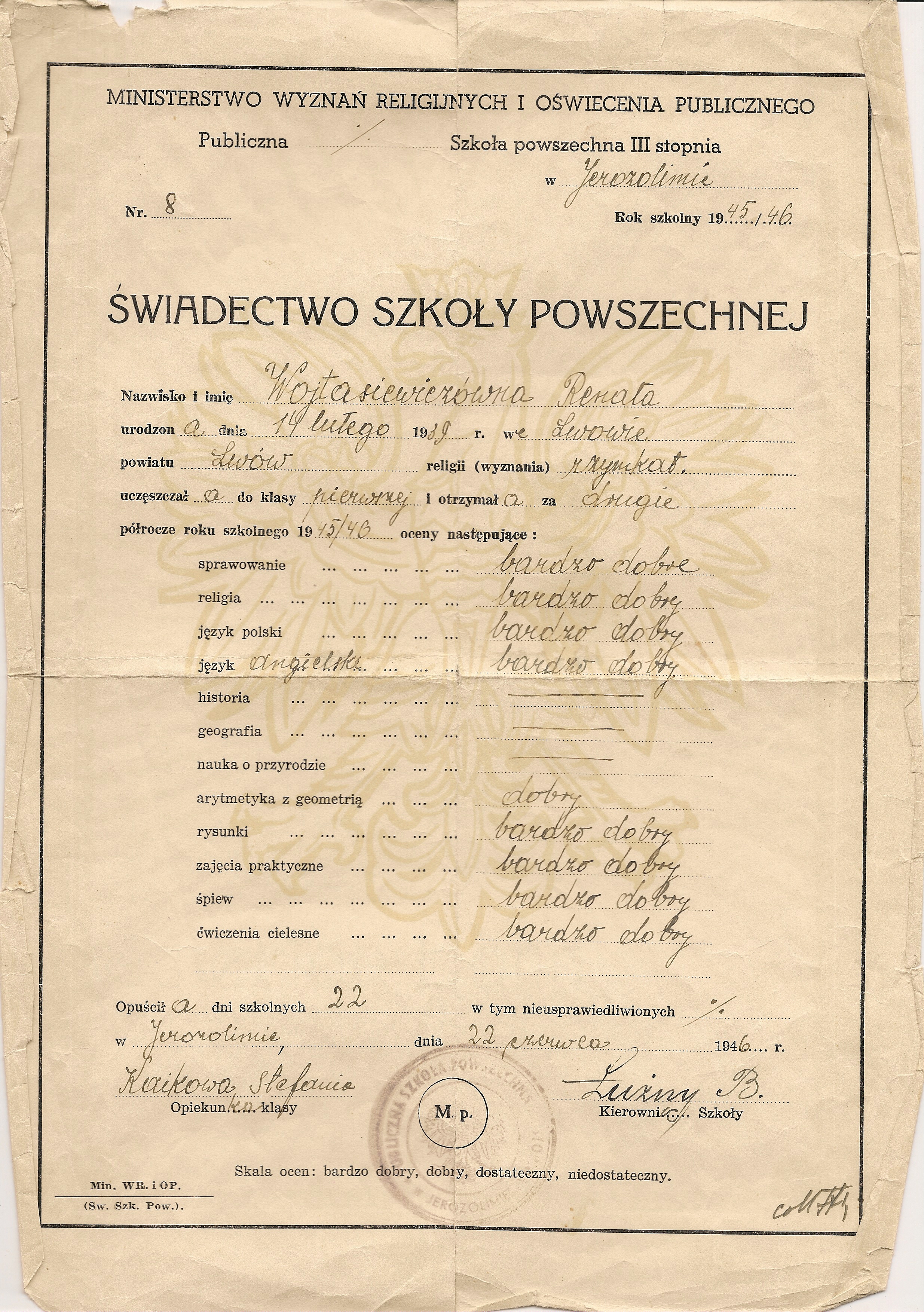 Dnia 12 kwietnia 2016 r. z okazji 76. rocznicy drugiej masowej deportacji Polaków na Sybir i do Kazachstanu w Zespole Szkół Technicznych im. gen. Władysława Andersa w Białymstoku odbyła się uroczystość upamiętniająca to historyczne i tragiczne dla Polaków wydarzenie. Honorowymi gośćmi były Sybiraczki z Białegostoku: Heronima Dzierma (ur. 1936 r.) i Renata Iwanowska (ur. 1939 r.). Uroczystość zorganizowali uczniowie II klasy technikum o profilu gastronomicznym, pod kierunkiem nauczyciela historii. Na początku spotkania uczniowie przedstawili najważniejsze fakty dotyczące agresji sowieckiej na Polskę we wrześniu 1939 r. i jej następstwa dla narodu polskiego. Aby lepiej zobrazować problematykę deportacji do ZSRR i życiorysy zaproszonych gości, młodzież przygotowała prezentację multimedialną z bogatą dokumentacją fotograficzną i pytania, które zadawała Sybiraczkom. Pani Heronima i pani Renata opowiadały o swoich przeżyciach związanych z genezą, przebiegiem i następstwem zesłania wraz z rodzinami na Sybir i do Kazachstanu w 1940 r. Ich rodziny zostały nazwane „wrogami narodu” tylko dlatego, że ich ojcowie piastowali ważne urzędy państwowe (sędzia i leśniczy). W 1940 r. musieli opuścić Polskę i byli traktowani jako przestępcy. W ciągu dwóch godzin spakowali dorobek życia i ruszyli w nieznane, ponieważ nikt z NKWD nie informował ich, gdzie i dlaczego wyjeżdżają. Sybiraczki przybliżyły sylwetki swych ojców, którzy wstąpili do Narodowych Sił Zbrojnych (armii gen. Andersa i gen. Berlinga), tworzonych w ZSRR po układzie Sikorski–Majski z 1941 r. Zawsze jednak, pomimo przeciwności losu, pamiętały, że są Polkami i głęboko wierzyły, że powrócą kiedyś do wolnej Polski. Mimo ciężkiej pracy, warunków bytowych, ciągłego głodu, mrozu, przeżyły i wróciły do ojczyzny. Wzruszający jest fakt, że w tak ekstremalnych warunkach uczyły się języka polskiego, historii. Panie z ogromnym szacunkiem i czcią wspominały swoich nauczycieli z Syberii i Kazachstanu. Osobiste świadectwa Sybiraczek z „nieludzkiej ziemi” wywarły duże wrażenie na zebranej młodzieży. Ich opowieści z dzieciństwa wzruszyły i skłoniły uczniów do zadumy i refleksji. Wiedza zdobyta na lekcjach historii została wzbogacona i potwierdzona osobiście przez świadków tamtych tragicznych wydarzeń. Młodzież ze łzą w oku i zaciekawieniem wysłuchała tych ciekawych i osobistych opowieści. Zorganizowana uroczystość stała się swoistą żywą i piękną lekcją historii, która na długo pozostanie w naszych sercach. Na zakończenie spotkania, po wspólnym odśpiewaniu Hymnu Sybiraków, dyrektor Zespołu Szkół Technicznych im. gen. W. Andersa Tadeusz Halicki podziękował pani Heronimie i pani Renacie za przybycie i podzielenie się swoimi wspomnieniami. Podkreślił, że żołnierze gen. Andersa, patrona naszej szkoły, również byli Sybirakami i dlatego jesteśmy zobowiązani zawsze o nich pamiętać. Spotkanie z Sybiraczkami w Zespole Szkół Technicznych im. gen. W. Andersa w Białymstoku Sybiraczki Heronima Dzierma (z lewej) i Renata Iwanowska Młodzież wzięła liczny udział w spotkaniu Dyrektor ZST Tadeusz Halicki serdecznie podziękował Sybiraczkom za udział w spotkaniu Dziadek Heronimy Dziermy – Paweł Bielawski przed wywózką Mała Renata Iwanowska (druga z prawej) z żołnierzami Polskich Sił Zbrojnych w Teheranie Świadectwo Szkoły Powszechnej w Jerozolimie Renaty Iwanowskiej Oprac.: Krzysztof Pogorzelski, nauczyciel historii w Zespole Szkół Technicznych im. gen. W. Andersa w Białymstoku Przeczytano 56 Nawigacja wpisu 10-lecie nadania imienia Gimnazjum im. Sybiraków w Zamościu Żywa lekcja historii w Łomiankach