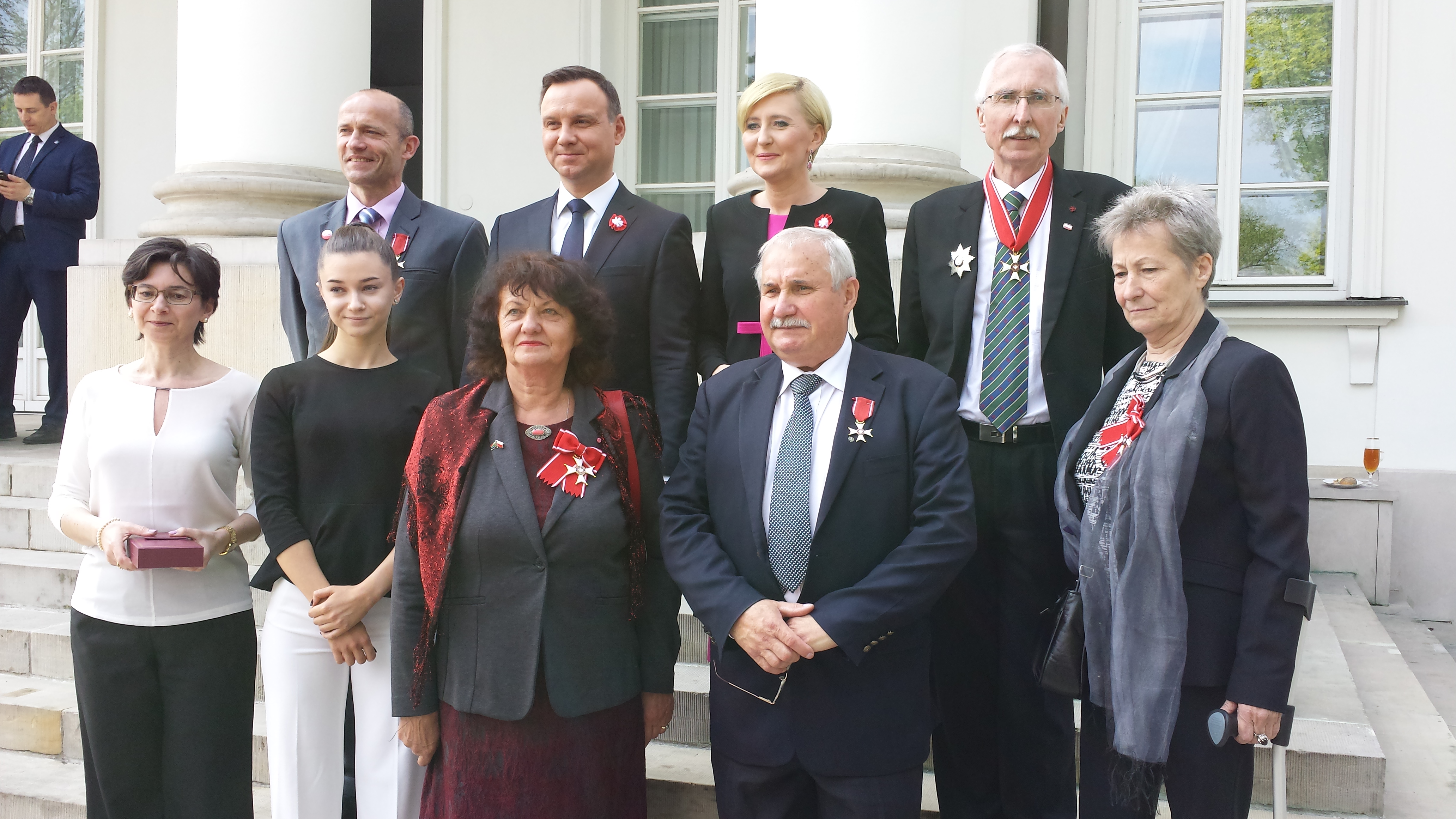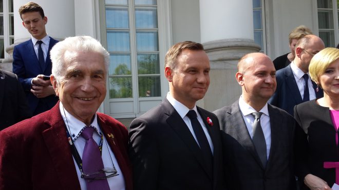 W dniu 2 maja 2016 r. na osobiste zaproszenie prezydenta Rzeczypospolitej Polskiej Andrzeja Dudy uczestniczyli w uroczystym spotkaniu z okazji Dnia Polonii i Polaków za Granicą oraz Dnia Flagi Rzeczypospolitej Polskiej nasi przedstawiciele: prezes Zarządu Głównego Związku Sybiraków Kordian Borejko oraz członek Zarządu Głównego Grzegorz Lipowski. Spotkanie odbyło się w Belwederze według ceremoniału wojskowego. Uczestnikami byli przedstawiciele Polonii z całego świata, którzy zostali odznaczeni przez prezydenta wysokimi odznaczeniami państwowymi. Organizacjom Związku Harcerstwa Polskiego poza granicami (liczy 700 tys. członków) oraz instytucjom wręczone zostały flagi narodowe. Prezydent przypomniał dzieje flagi. Już na Wielkiej Chorągwi Krakowskiej był biały orzeł w koronie na czerwonym tle, a podczas walki z Krzyżakami wojska polsko-litewskie odbiły przejętą przez nich chorągiew i rozbiły ich armię. Sejm Rzeczypospolitej Polskiej w 1831 r. uchwalił, że polskimi barwami narodowymi jest kolor biało-czerwony, do dnia dzisiejszego przez wszystkich uznawany i szanowany. Prezydent poinformował też, że podpisał w tym dniu inicjatywę ustawodawczą o uchwaleniu polskiej legitymacji szkolnej dla dzieci polonijnych, która daje takie same uprawnienia podczas przebywania w Polsce, jakie mają dzieci zamieszkujące w Polsce. Po części oficjalnej odbyło się spotkanie w ogrodach Belwederu, podczas którego mogliśmy nawiązać bliższy kontakt m.in. z Barbarą Kukulską z Republiki Południowej Afryki, inicjatorką założenia tam Związku Sybiraków i redaktorką tamtejszych „Wiadomości Polonijnych”, odznaczoną przez prezydenta Krzyżem Komandorskim Orderu Odrodzenia Polski. Podczas rozmowy pani Kukulska wspomniała, że poprzedniego dnia była na spotkaniu w Oddziale Związku Sybiraków w Łodzi z którego ma bardzo miłe wspomnienia. Nawiązany też został kontakt z księdzem pełniącym misję w Australii Przemysławem Karasiukiem. Reprezentująca Zjednoczenie Polskie w Johannesburgu (RPA) Barbara Kukulska (w pierwszym rzędzie pośrodku) została odznaczona przez prezydenta Krzyżem Komandorskim Orderu Odrodzenia Polski Grzegorz Lipowski z prezydentem Andrzejem Dudą Oprac.: Grzegorz Lipowski Przeczytano 25 Nawigacja wpisu Biało-czerwone serca uczniów Gimnazjum nr 1 im. Zesłańców Sybiru w Bielawie Uroczystości 3 maja na terenie Oddziału ZS w Legnicy