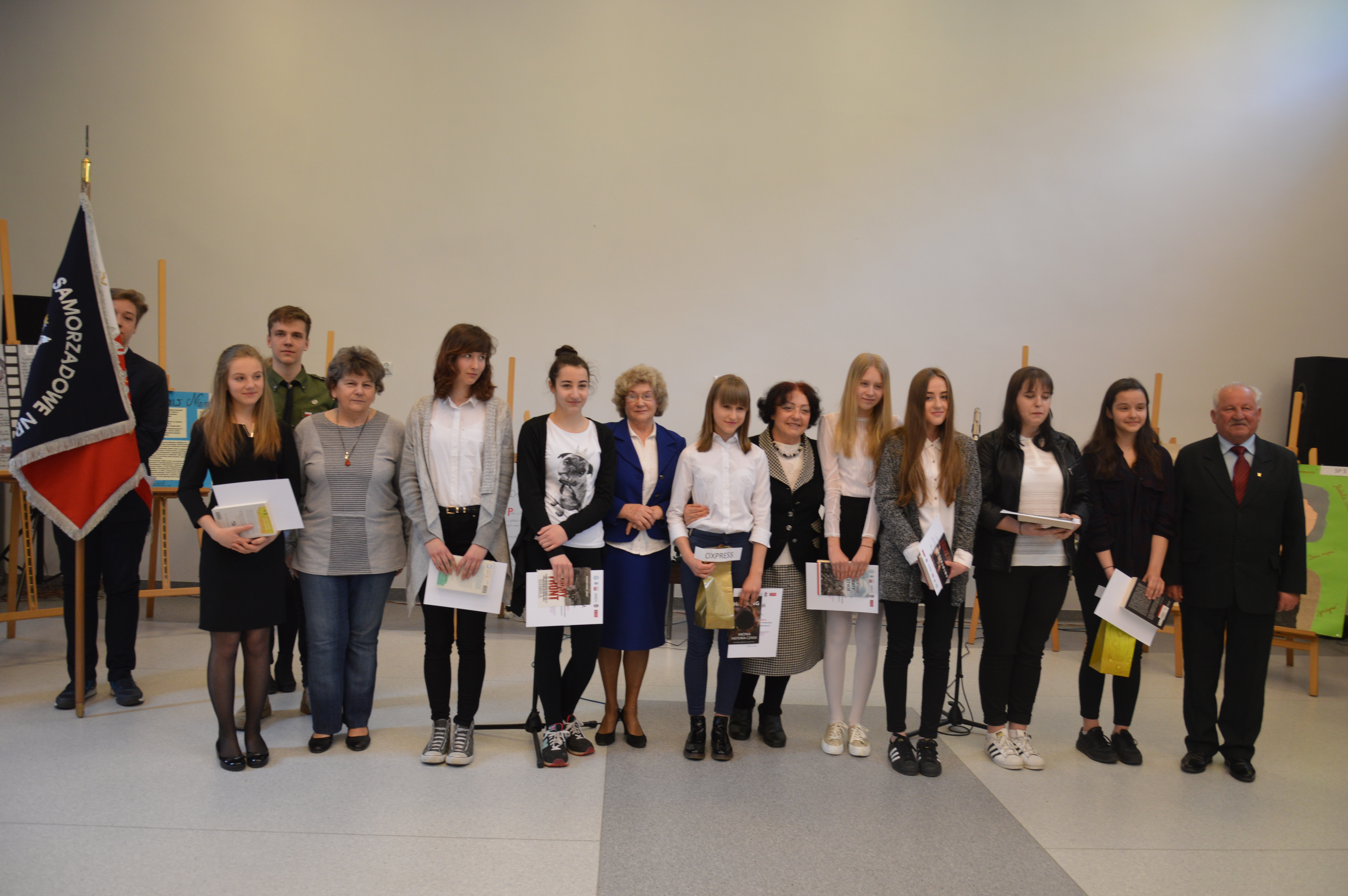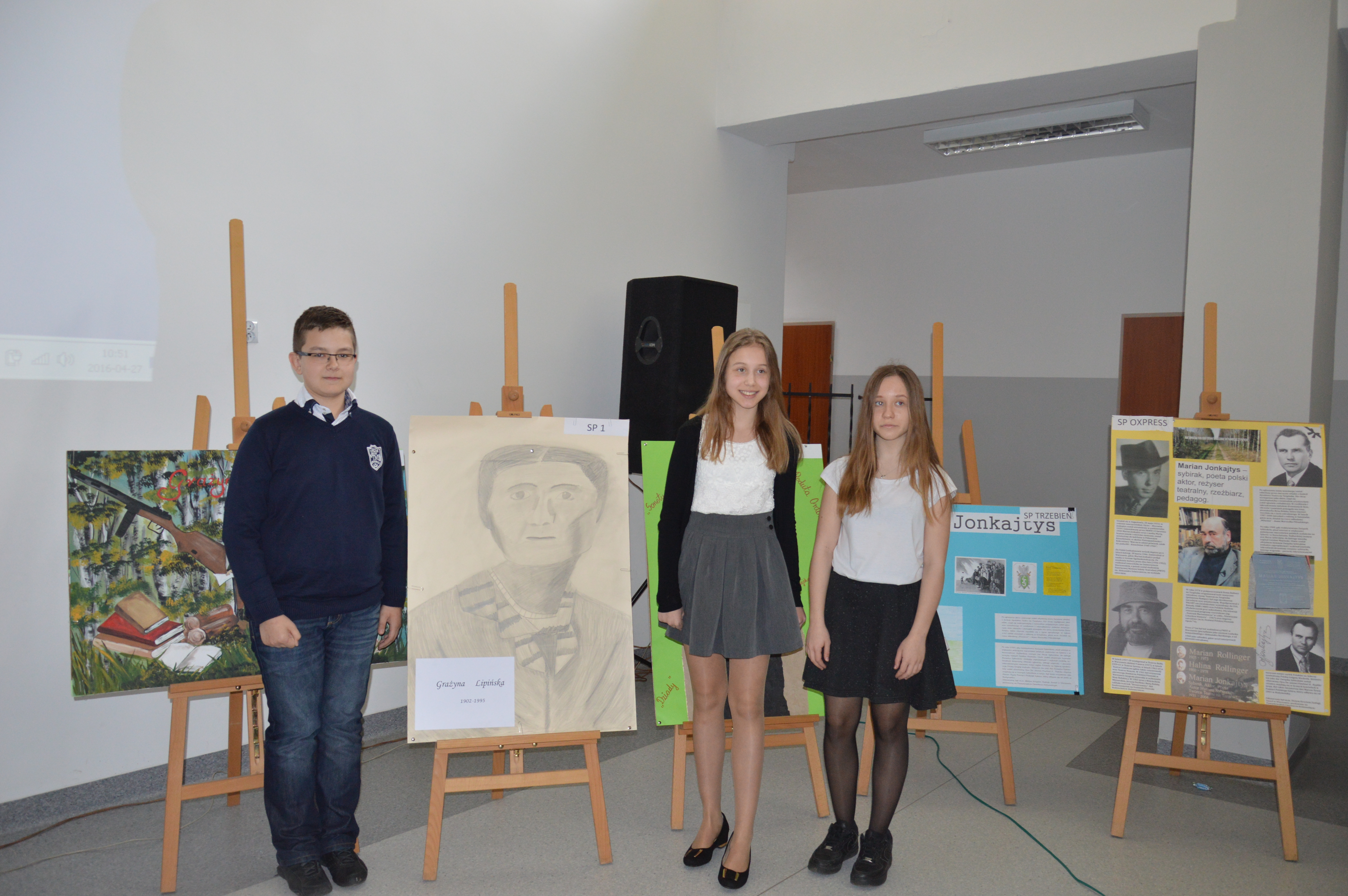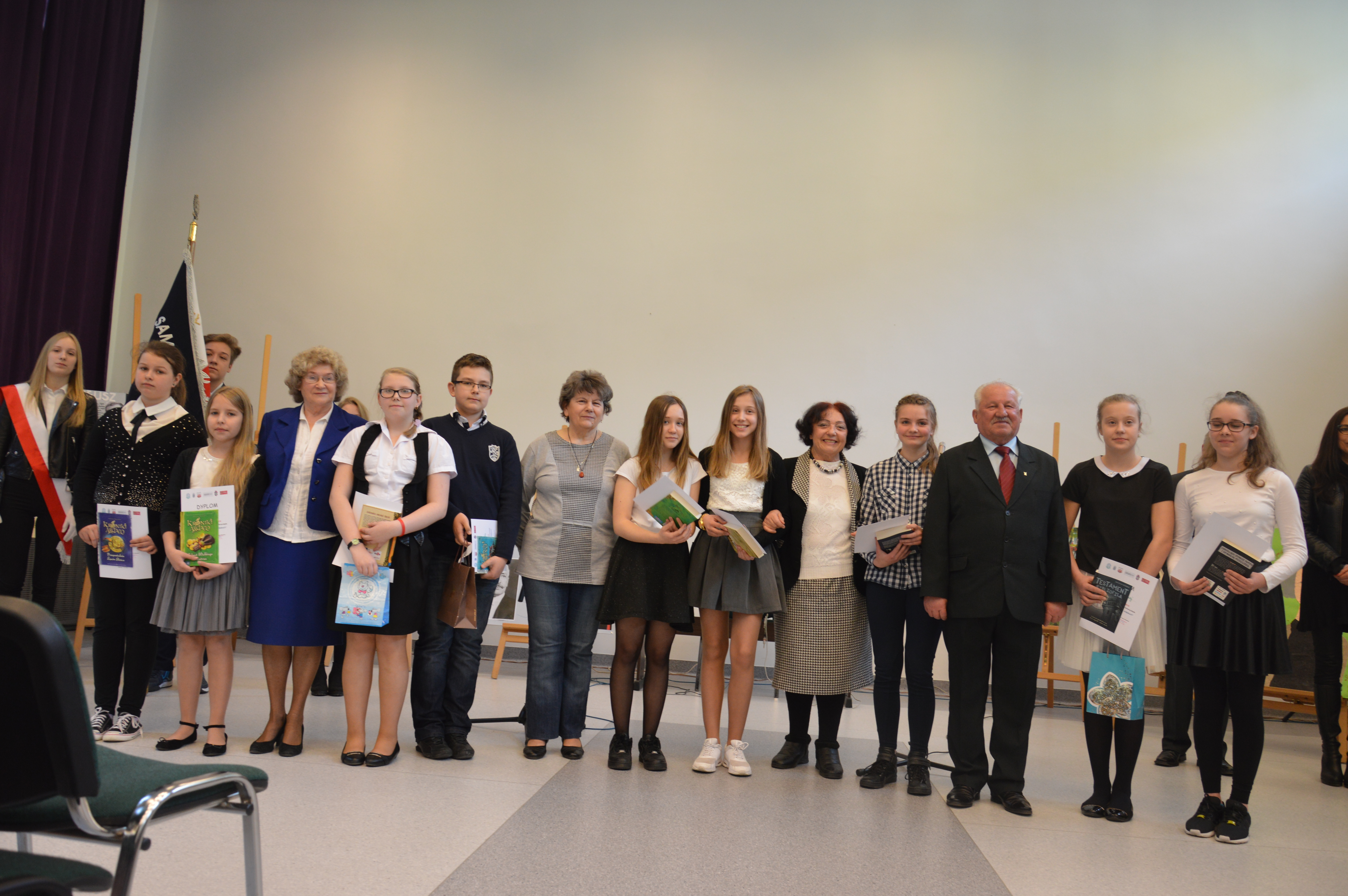 27 kwietnia 2016 r. Gimnazjum Samorządowe nr 2 im. Polaków Zesłanych na Sybir w Bolesławcu stało się miejscem szczególnie ważnego wydarzenia – cyklicznego konkursu „Ocalić od zapomnienia” – „Sybiracy” i „Kresowiacy”. Serdeczna współpraca z Sybirakami i Kresowiakami sprawia, że możemy korzystać z żywego przekazu historycznego w czasie lekcji, uroczystości szkolnych, licznych spotkań z tymi niezwykłymi ludźmi. Jednym z owoców tej współpracy jest wspomniany konkurs historyczny, objęty honorowym patronatem przez Muzeum Pamięci Sybiru, prezydenta miasta Bolesławiec, Związek Sybiraków, Towarzystwo Miłośników Lwowa i Kresów Południowo-Wschodnich oraz księgarnię Papirus. W tegorocznej edycji wzięło udział pięć drużyn ze szkół podstawowych oraz pięć z bolesławieckich gimnazjów. Uczestnicy konkursu przygotowali plakaty przedstawiające bohaterów z cyklu „Znani Sybiracy” i „Znani Kresowiacy”. Występ każdej z drużyn, prezentujących wybraną postać, dostarczył widzom niezapomnianych wrażeń. Wśród niezwykłych pomysłów młodych historyków znalazły się scenki teatralne, autorskie piosenki, wiersze, wspaniałe wykonania popularnych utworów, np. Czesława Niemena, multimedialne prezentacje, fragmenty filmów. W oczekiwaniu na wyniki konkursu uczestnicy obejrzeli wystawę „Dar pamięci”, która przybyła do nas aż z Białegostoku z Muzeum Wojska. Wystawa wywołała zainteresowanie nie tylko uczniów, ale również nauczycieli opiekunów i jurorów. Jury składające się z przedstawicieli Sybiraków i Kresowiaków, uczniowie i ich opiekunowie głosowali na zwycięskie drużyny, wrzucając do kolorowych torebek… cukierki. Ten wcześniej sprawdzony, słodki sposób przyznawania punktów i tym razem wywołał wiele emocji. I tak wyłoniono laureatów konkursu. W kategorii szkół podstawowych wyniki przedstawiają się następująco: I miejsce – drużyna ze Szkoły Podstawowej Oxpress II miejsce – zespół ze Szkoły Podstawowej nr 1 III miejsce – drużyna reprezentująca Zespół Szkolno-Przedszkolny w Trzebieniu. Wśród gimnazjów: I miejsce zajęła drużyna z Gimnazjum Samorządowego nr 1 II miejsce przypadło zespołowi z Gimnazjum Oxpress III miejsce otrzymali przedstawiciele Gimnazjum Samorządowego nr 2 im. Polaków Zesłanych na Sybir. W dalszej części spotkania o godz. 12 rozpoczął się uroczysty apel. Po wzruszającej recytacji wiersza poświęconego Sybirakom w wykonaniu Kai Szylar pod opieką Ewy Ołenicz-Bernackiej, głos zabrali znamienici goście oraz dyrektor naszej szkoły Maria Subik, która operując metaforą, podkreśliła wagę historii w życiu współczesnych Polaków. Człowiek rodzi się w określonym momencie dziejów, dorasta i dojrzewa, przypomina widza, który trafia do kina w trakcie seansu. By móc zrozumieć przesłanie i puentę filmu, musi również znać jego początek. Ta myśl obrazowo oddaje potrzebę sięgania do ważnych wydarzeń w dziejach narodu, które jednocześnie wiążą się z tragicznymi losami Polaków. Dyrektor podkreśliła, iż wielkim szczęściem i przywilejem, z którego możemy korzystać, są spotkania z ludźmi, którzy ową historię narodu tworzyli – Sybirakami, Kresowiakami, działaczami „Solidarności”, którzy walczyli o naszą wolność w latach 80. minionego wieku. Stanisław Wyganowski – przedstawiciel prezydenta miasta Bolesławiec oraz Jan Filipek – działacz „Solidarności”, Honorowy Obywatel Miasta – w swoich przemówieniach podziękowali dyrekcji, nauczycielom oraz uczniom naszego gimnazjum za pamięć o ludziach, faktach, za dbałość w krzewieniu umiłowania ojczyzny i jej historii. Jan Filipek, jak co roku, złożył również róże pod dębami pamięci, które w tym dniu były przewiązane biało-czerwonymi szarfami. Uroczystość zakończyło mistrzowskie wykonanie pieśni pt. „Kronika” przez zespół wokalny w składzie: Magdalena Cichorzewska, Eliza Sondaj, Marika Zdunek, Sandra Mierzwa, Julita Szymańska i Marcel Sas pod kierownictwem Justyny Rapy. Tegoroczną edycję konkursu przygotowały Joanna Kupisz i Małgorzata Janowska. Prezentacja prac konkursu „Ocalić od zapomnienia – Sybiracy” Konkursowe prace przedstawiających znanych Kresowiaków Zaproszeni goście Laureaci konkursu w kategorii szkół podstawowych Zwycięscy gimnazjaliści Wystawa „Dar pamięci” przygotowana przez Muzeum Wojska w Białymstoku Jeden z dębów pamięci na terenie Gimnazjum Samorządowego nr 2 im. Polaków Zesłanych na Sybir w Bolesławcu Oprac.: Małgorzata Janowska, nauczycielka Gimnazjum Samorządowego nr 2 im. Polaków Zesłanych na Sybir w Bolesławcu Przeczytano 59 Nawigacja wpisu Spektakl z cyklu „Uczniowie obchodzą ważne rocznice historyczne” pt. „Losy Zesłańców Sybiru” Biało-czerwone serca uczniów Gimnazjum nr 1 im. Zesłańców Sybiru w Bielawie