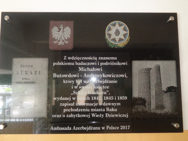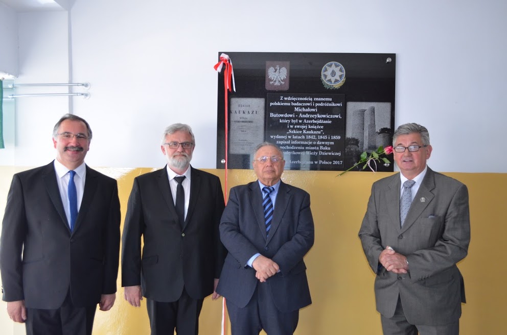 2 czerwca 2017 r. na terenie Gimnazjum nr 6 im. Zesłańców Sybiru i VI Liceum Ogólnokształcącego im. Zesłańców Sybiru w Toruniu odbyła się niecodzienna uroczystość. Odsłonięto tablicę pamiątkową poświęconą Michałowi Butowdowi-Andrzeykowiczowi – polskiemu zesłańcowi, który przebywając na Kaukazie w połowie XIX w., opisał przeszłość i teraźniejszość; ludność i kulturę ówczesnego Kaukazu. Inicjatorem tego wydarzenia był ambasador Republiki Azerbejdżanu w Polsce Hasan Hasanov. Ambasador był w naszej szkole honorowym gościem, ale też współgospodarzem uroczystości. Patronat honorowy objęli marszałek województwa kujawsko-pomorskiego Piotr Całbecki i prezydent miasta Torunia Michał Zaleski. Na początku odegrane zostały hymny Polski i Azerbejdżanu, następnie dyrektor Zespołu Szkół nr 1 Zbigniew Matuszewicz powitał przybyłych gości. Odsłonięcie tablicy swoją obecnością uświetnili: licznie przybyli Sybiracy, Zbigniew Rasielewski – zastępca prezydenta miasta Torunia, Janusz Wojciechowski – dyrektor Delegatury Kujawsko-Pomorskiego Urzędu Wojewódzkiego w Toruniu, Denis Dembek – naczelnik Wydziału Współpracy Zagranicznej Urzędu Marszałkowskiego, Jan Myrcha – członek Zarządu Głównego Związku Sybiraków, prezes toruńskiego Zarządu Oddziału ZS, Kazimierz Wach ze Światowego Związku Żołnierzy AK – Okręg Toruń, Katarzyna Nowicka-Skuza – zastępca dyrektora Wydziału Edukacji Urzędu Miasta Torunia, ks. prałat Józef Nowakowski – kapelan Sybiraków, Mirosław Bartulewicz – komendant Straży Miejskiej w Toruniu, st. chor. szt. Mirosław Żelichowski – komendant Placówki Żandarmerii Wojskowej w Toruniu, mjr Wiesław Wąsicki – zastępca komendanta Wojskowej Komendy Uzupełnień w Toruniu, nadkomisarz Dorota Rybszleger – komendant Komisariatu Toruń-Śródmieście, Elżbieta Skierska z Fundacji gen. Elżbiety Zawackiej Archiwum i Muzeum Pomorskie AK oraz Wojskowej Służby Polek, Rafał Świechowicz – dowódca Jednostki Ratowniczo-Gaśniczej nr 1 w Toruniu, Urszula Polak – prezes oddziału ZNP w Toruniu, Jerzy Wiśniewski – przewodniczący komisji międzyzakładowej NSZZ „Solidarność” pracowników oświaty i wychowania oraz, oczywiście, uczniowie i nauczyciele Zespołu Szkół nr 1 w Toruniu. Swoje przemówienie dyrektor Zbigniew Matuszewicz rozpoczął od stwierdzenia, że dzięki tej uroczystości pamięci zostaje przywrócony bohater, o którym dotychczas niewiele wiedzieliśmy. Podkreślił także podobieństwo historii Polski i Azerbejdżanu. Oba kraje w podobnym okresie zostały poddane dominacji rosyjskiej i podjęły próbę odzyskania wolności. Toruń i Azerbejdżan łączy też osoba króla Kazimierza Jagiellończyka, który dla tego miasta ma szczególne znaczenie, a za jego panowania właśnie zostały nawiązane stosunki dyplomatyczne między naszymi dwoma krajami. Historia bohatera uroczystości przypada na XIX w. (ok. 1780–1860). Był jednym z wielu młodych Polaków, którzy doświadczyli przymusowego pobytu na zesłaniu. Na Kaukazie przebywał jako zesłaniec polityczny przez 18 lat. Trafił tam za przynależność do ruchu spiskowego, kierowanego przez Szymona Konarskiego, szerzącego się na Ukrainie, Białorusi, Litwie. Był studentem Uniwersytetu Wileńskiego. Pochodził z rodziny szlacheckiej, osiadłej w północno-zachodniej części Litwy, określanej mianem historycznym Żmudzią. Urodził się i wychowywał w Połtawie. Przedstawiciele rodziny uczestniczyli aktywnie w życiu politycznym, m.in. Michał Butowd-Andrzeykowicz h. Gryf był gubernatorem grodzieńskim i wołyńskim. Za działalność polityczną został ukarany obowiązkiem odbycia służby wojskowej w garnizonach kaukaskich. Skierowano go do artylerii stacjonującej w Tyflisie (obecnie Tbilisi). Przebywał tam przez dwa lata. Następnie wraz ze swoim garnizonem od 8 (20) marca 1840 r. przenosił się do różnych miejscowości w Azerbejdżanie i Dagestanie. W Tyflisie spotkał kilka osób ujawniających zainteresowania literackie. Nawiązał z nimi bliższe kontakty towarzyskie. Później zaczęto ich określać mianem „kaukaskiej grupy poetów”. Nawiązał kontakty z Józefem Ignacym Kraszewskim, wydającym w latach 1841–1851 w Wilnie „Athenaeum. Pismo zbiorowe poświęcone historii, filozofii, literaturze, sztukom itd.”. Spowodował on opublikowanie na łamach pisma studium Michała Butowda-Andrzeykowicza pt. „Szkice Kaukazu”. Opracowanie spotkało się z uznaniem wydawcy, co wyraziło się w przetłumaczeniu jego fragmentu na język rosyjski oraz wyrażeniu uznania na łamach „Biblioteki Warszawskiej”. Jak dalej podkreślił dyrektor Matuszewicz, „Szkice Kaukazu” dostarczają wiedzy na temat różnorodności geograficzno-przyrodniczej, życia społecznego, zachowań i świata wartości ludzi tego regionu. Autor zwracał bowiem uwagę przede wszystkim na odmienność kulturową ludności; sam np. brał udział w spotkaniu czcicieli ognia. Stąd uznaje się te szkice za pionierskie w polskiej literaturze studium kaukazologiczne. Ambasador Republiki Azerbejdżanu na wstępie podziękował za niezwykle serdeczne przyjęcie i ogromne zaangażowanie społeczności szkolnej w przygotowanie uroczystości. Również podkreślił podobieństwo losów i historii ludności obu państw, dlatego, jak stwierdził, jego misją stało się przybliżanie sylwetek Polaków, którzy odegrali istotną rolę w Azerbejdżanie, a w Polsce są praktycznie nieznani. Szczególnie więc spodobała mu się prezentacja przygotowana przez nauczycieli i uczniów, w której przedstawiono innych naszych rodaków zasłużonych dla Azerbejdżanu. Odniósł się do przywołanych postaci: braci Kryczyńskich – budowniczych azerskich instytucji państwowych; Witolda Zglenickiego nazywanego „ojcem bakijskiej nafty” czy architektów: Józefa Wikientiewicza Gosławskiego, Józefa Płoszki i Kazimierza Skór
